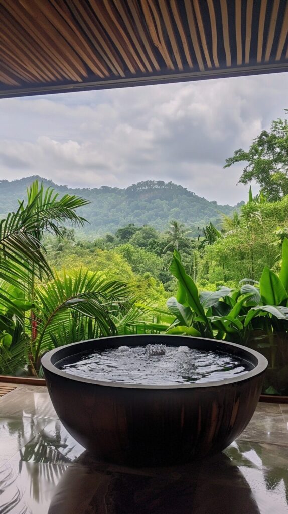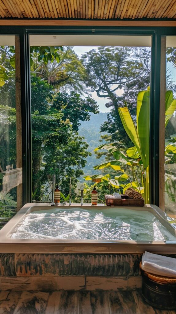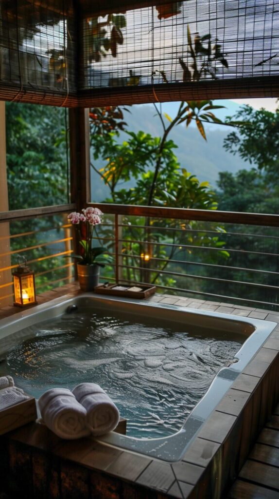 使用したプロンプトはこちら▼ <prompt> The combination of the comfortable bathtub and the scenery outside the resort. --ar 9:16