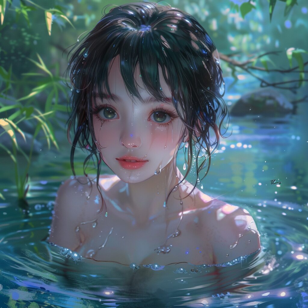 使用したプロンプトはこちら▼ <prompt> (8k, best quality, masterpiece, ultra high res, highly detail face:1.3), portrait,(20 years old girl:1.3), beautiful, kawaii, 1girl, (medium-short dark brown hair),huge hot spring in nature, nature view, soak in water, front, scoop water