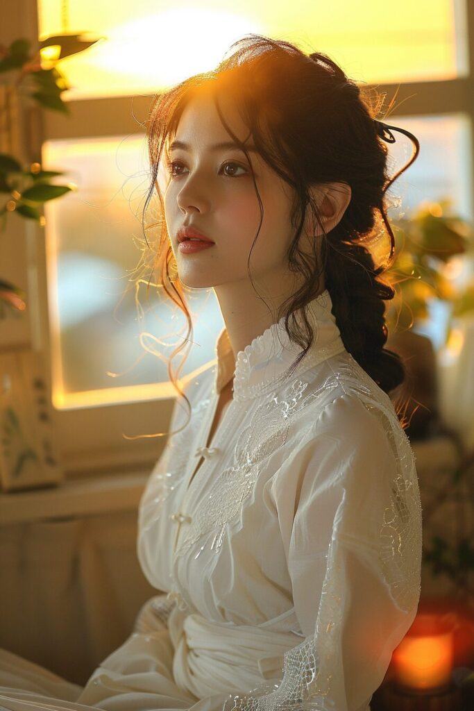 使用したプロンプトはこちら▼ <prompt> young Japanese asian girl having her hair braided, in the style of precise and lifelike, 8k resolution, aurorapunk, macro lens, mori kei, shiny eyes, dark white and light pink --ar 63:64 --v 6.0