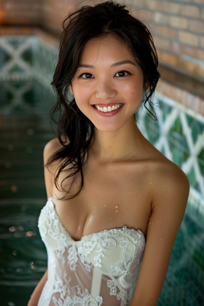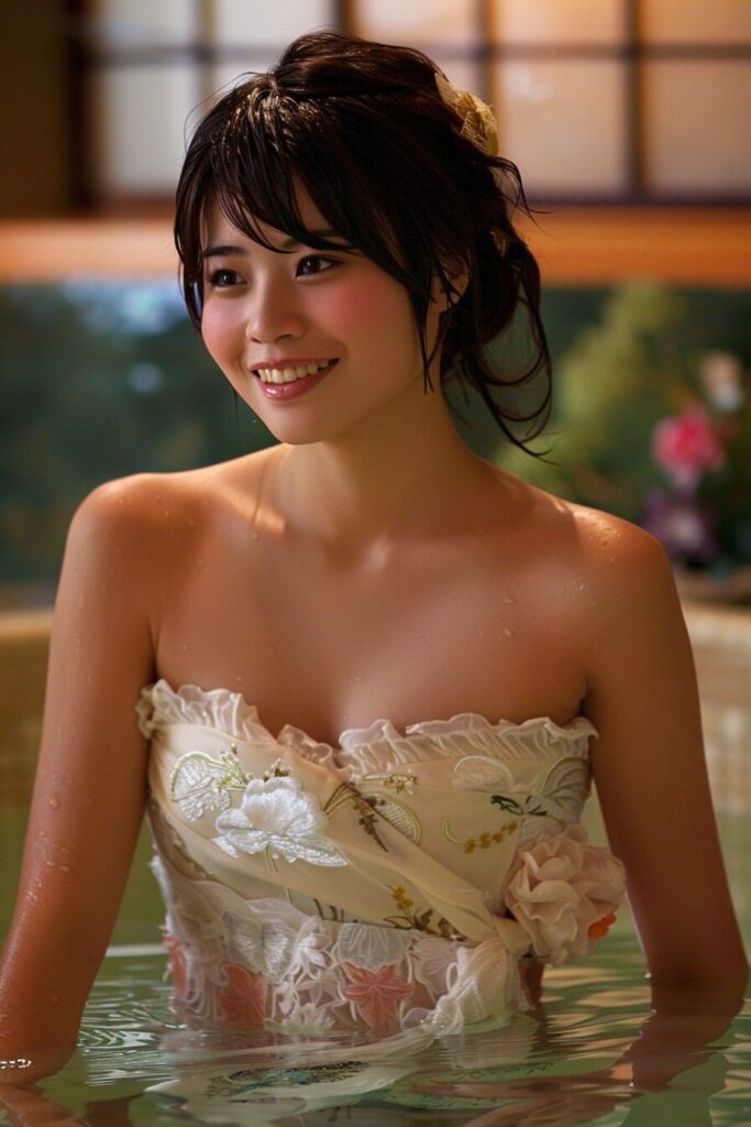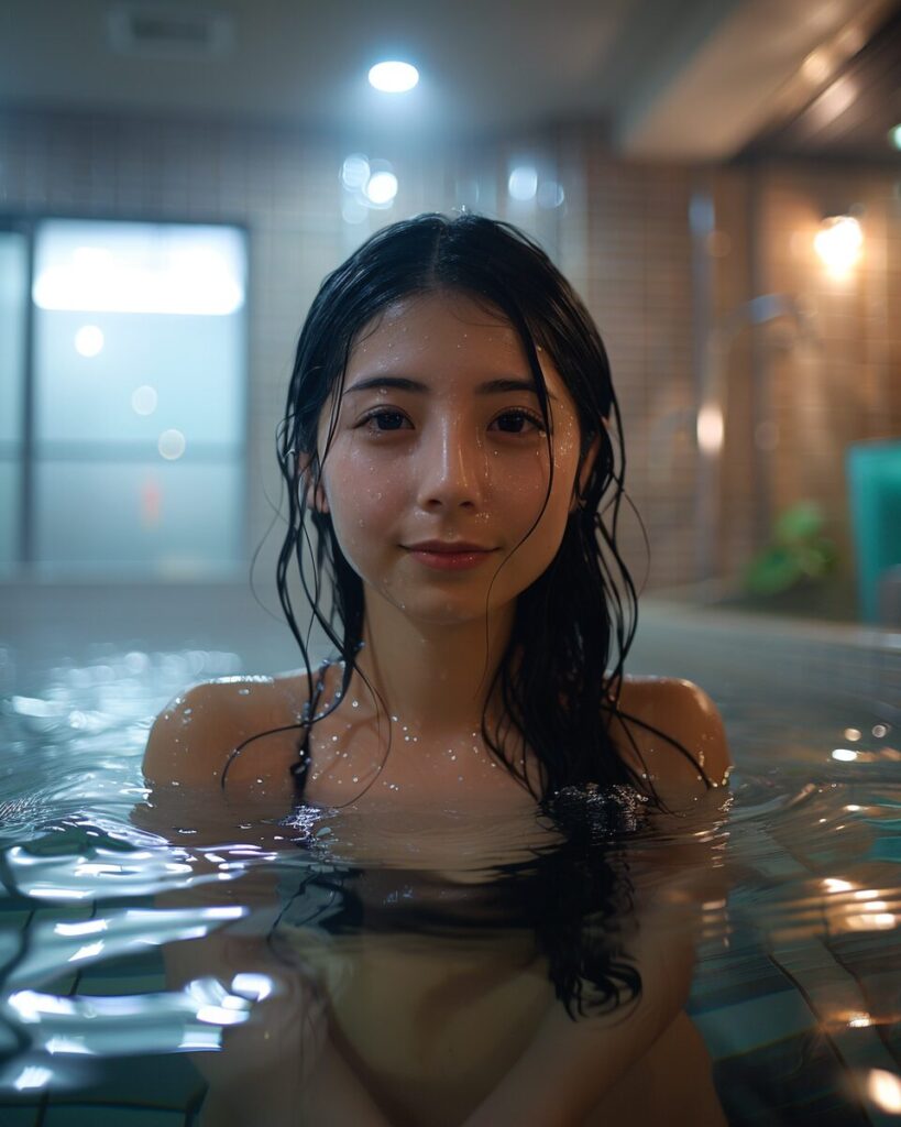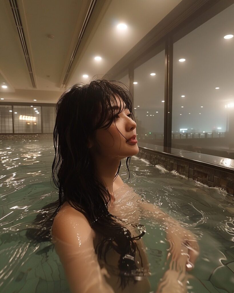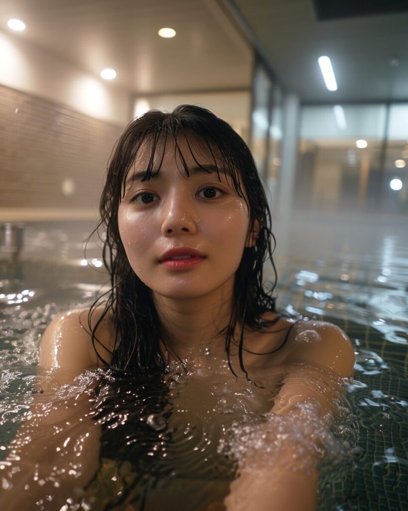 使用したプロンプトはこちら▼ <prompt> a beautiful and cute woman taking a selfie in the water, modern hot spring hotel, in the room, fog, bathtub, --ar 4:5 --stylize 750