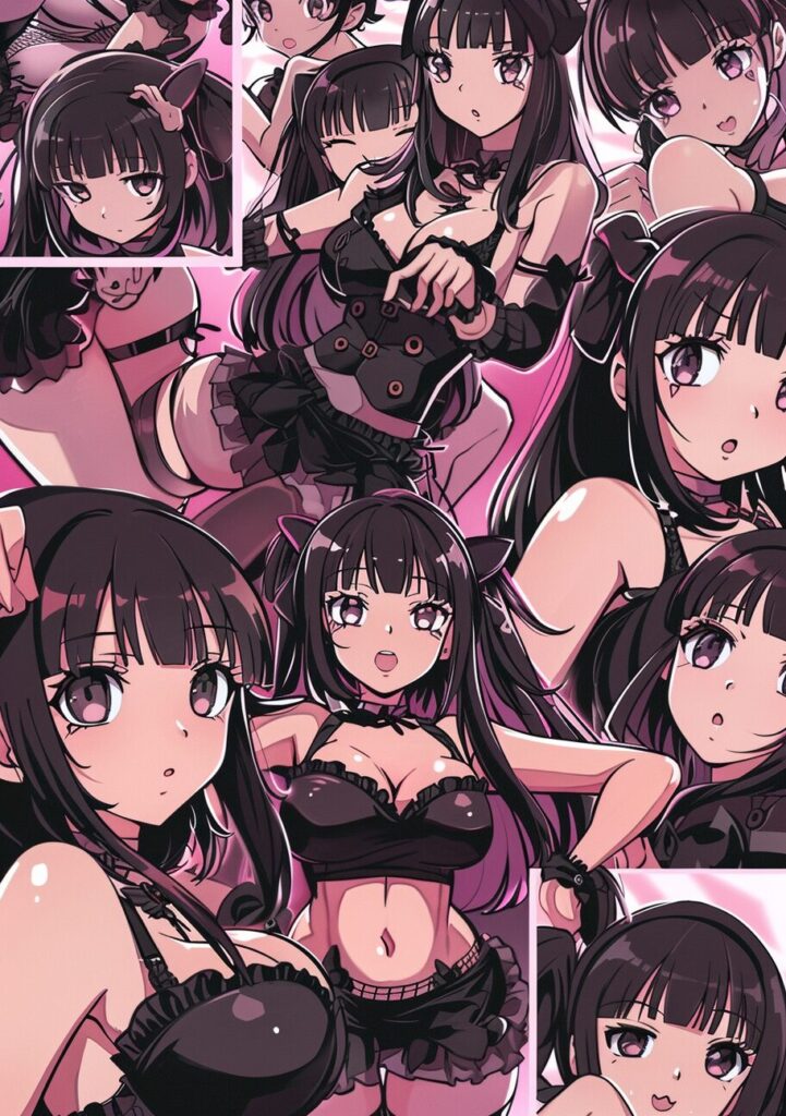 使用したプロンプトはこちら▼ <prompt> a collection of pictures of different anime girls and their bodies, girl anime character, multiple poses and expression, 100% white background , anime style, simple, cute, full color, light and shadow, black hair, casual wear, flat color, --ar 9:16 --stylize 1000