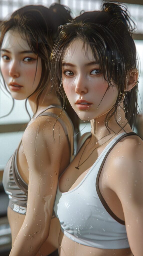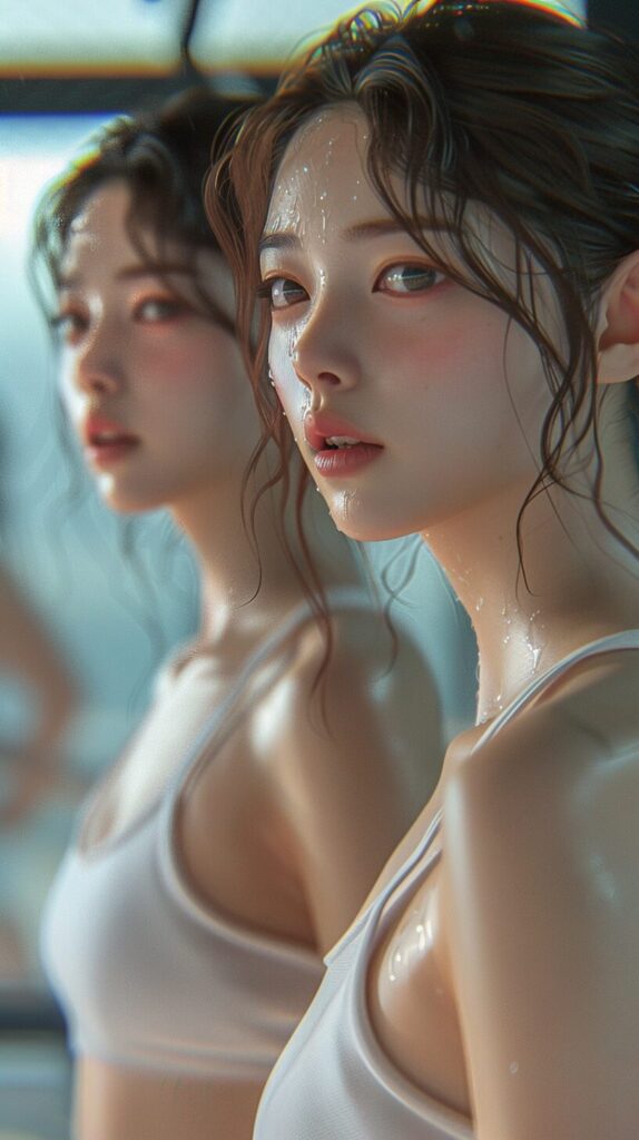 使用したプロンプトはこちら▼ <prompt> Depicting two supremely beautiful, delicate and exquisite Korean Elf student with chubby figure and drenching in sweat due to intense exercise at the gym, with RTX path tracing cinematic photorealistic natural light rendering masterpiece style, wearing an white elegant exercise tank top --ar 9:16 --style raw