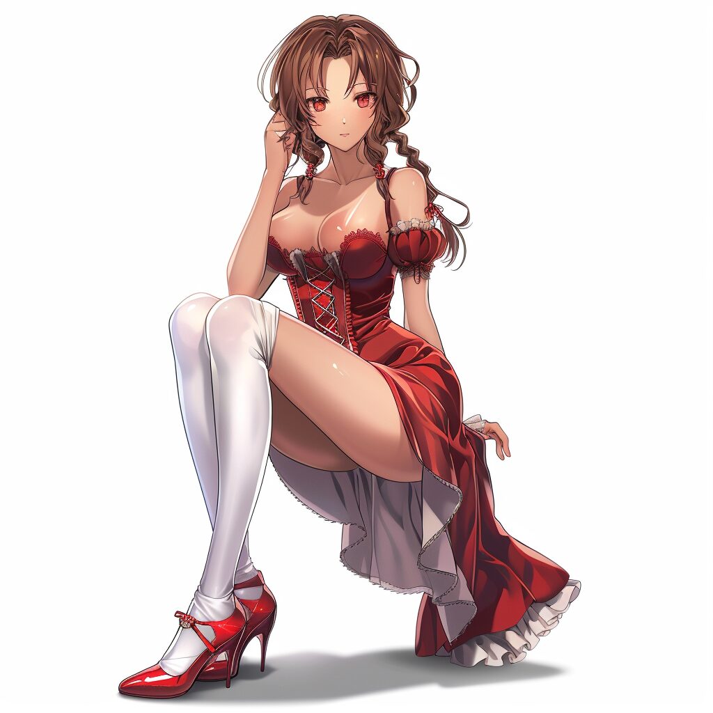 使用したプロンプトはこちら▼ <prompt> a slender anime woman, she has brown hair elegantly done up in folds and braids, she is wearing a red velvet dress, she is wearing white tights, she wears shiny red high heels, she is skinny, she has a pretty face, she is smiling