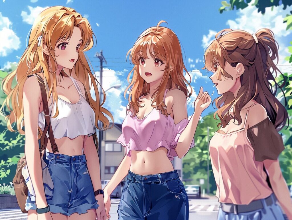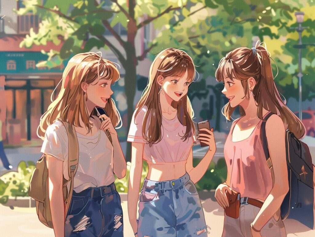 使用したプロンプトはこちら▼ <prompt> (人物地点) In the picture, there are three teenage girls chatting. (具体的人物衣着动作) The girl on the far left has long, golden hair and is wearing a white top with jeans. She has a single-shoulder backpack on. (心情描写) She's attentively listening to the other two girls who are talking. The girl in the middle has brown hair, a pink top, and she's holding a cellphone. She's discussing something on the phone with the girl on the right. The girl on the far right has a smiling face and is listening to the middle girl speak. I think they might be good friends or classmates.(背景物品) In the background, there's a short building, and on both sides, there are some trees, so it could be a school or a library. (天气) Judging by what they're wearing, it seems like the weather is warm. --ar 4:3