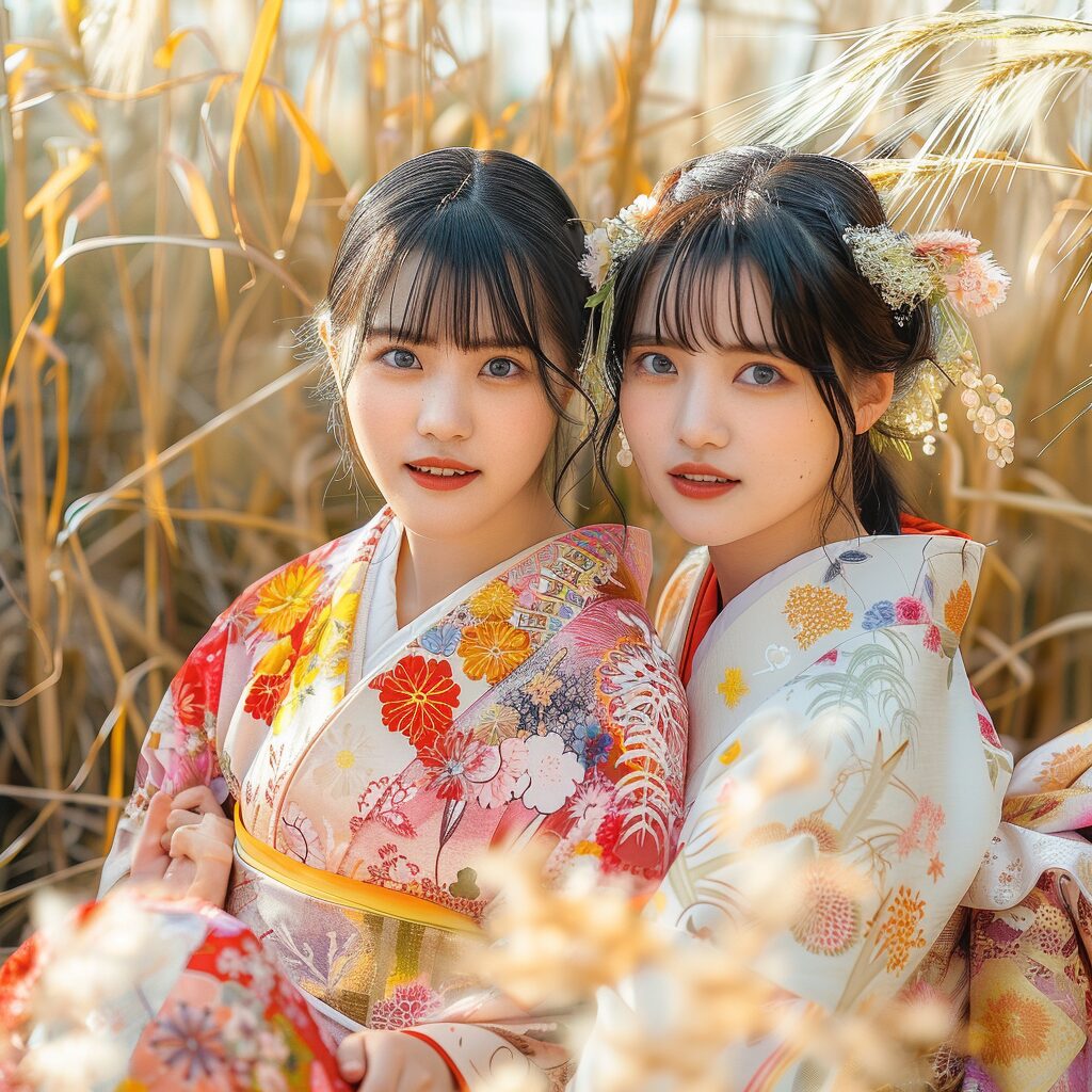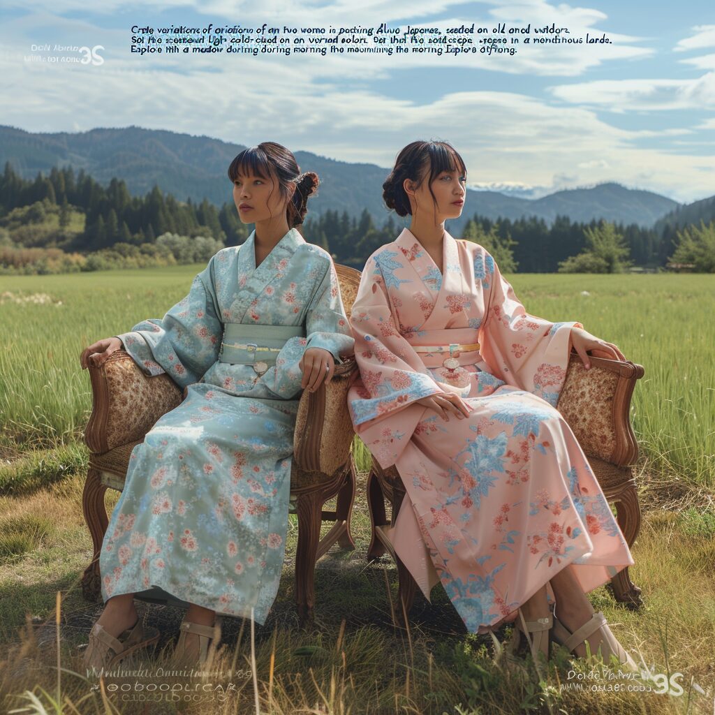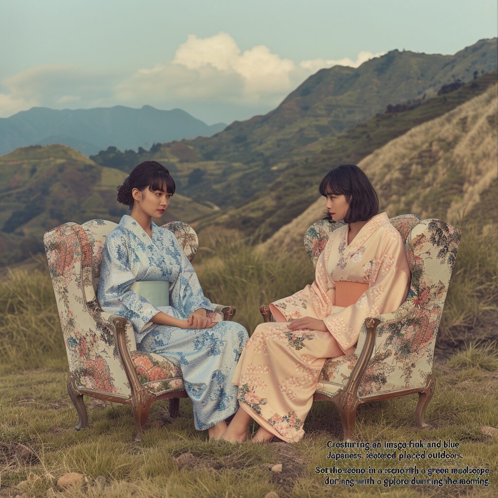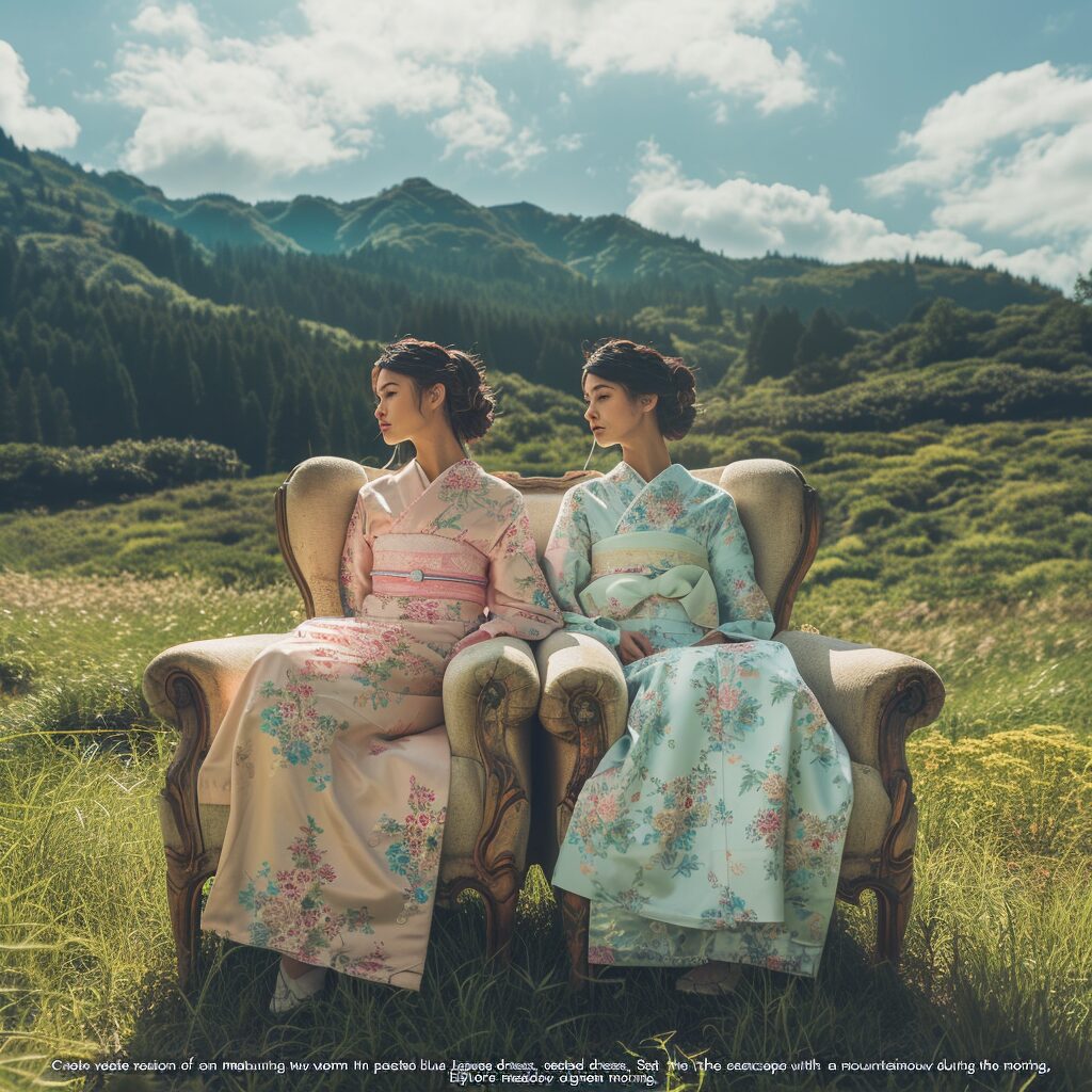 使用したプロンプトはこちら▼ <prompt> "Create variations of an image featuring two women in pastel pink and blue Japanese dresses, seated on an old and worn-out light-colored armchair placed outdoors. Set the scene in a mountainous landscape with a green meadow during the morning. Explore different compositions to capture the serene and picturesque atmosphere of the outdoor setting. hiper realistic photography. cinemaography."