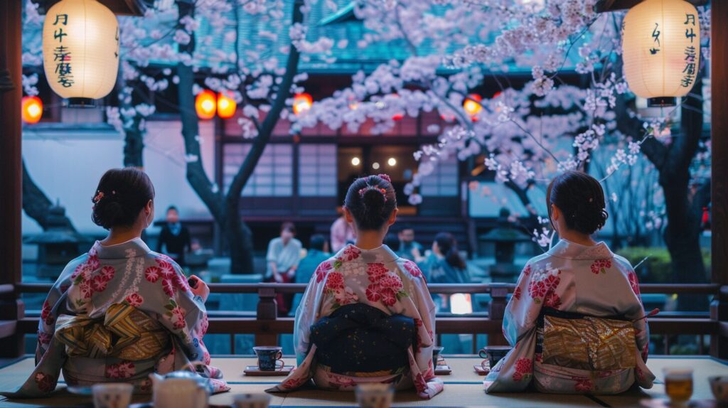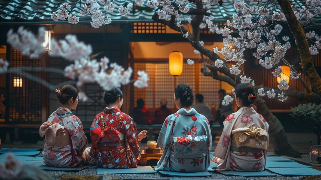 使用したプロンプトはこちら▼ <prompt> Captivating scene of coworkers bonding in Tokyo, dressed in elegant yukatas, enjoying a traditional green tea ceremony beneath a beautiful cherry blossom tree at dusk. --ar 16:9 --style raw