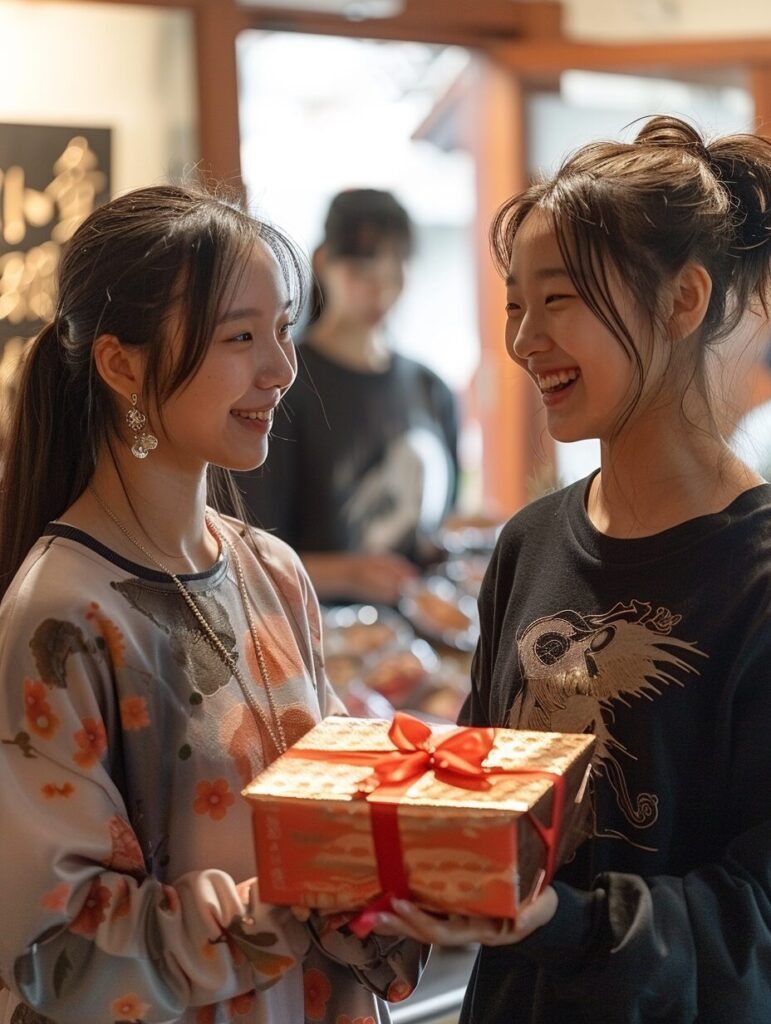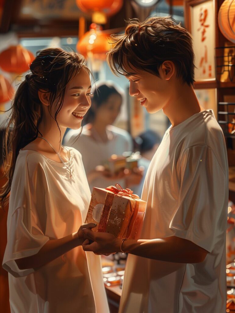 使用したプロンプトはこちら▼ <prompt> Two Chinese college students exchange gifts during the festival,Between young people,In the room,There are blurred figures in the background,high detail,4K,hyper quality --no snow --ar 3:4 --stylize 750