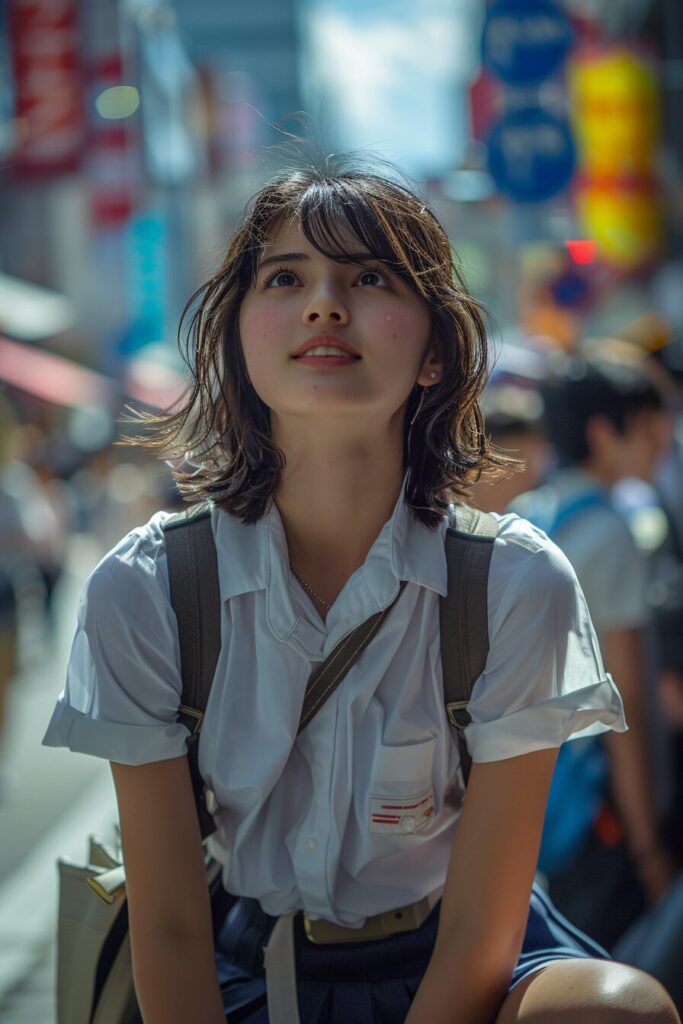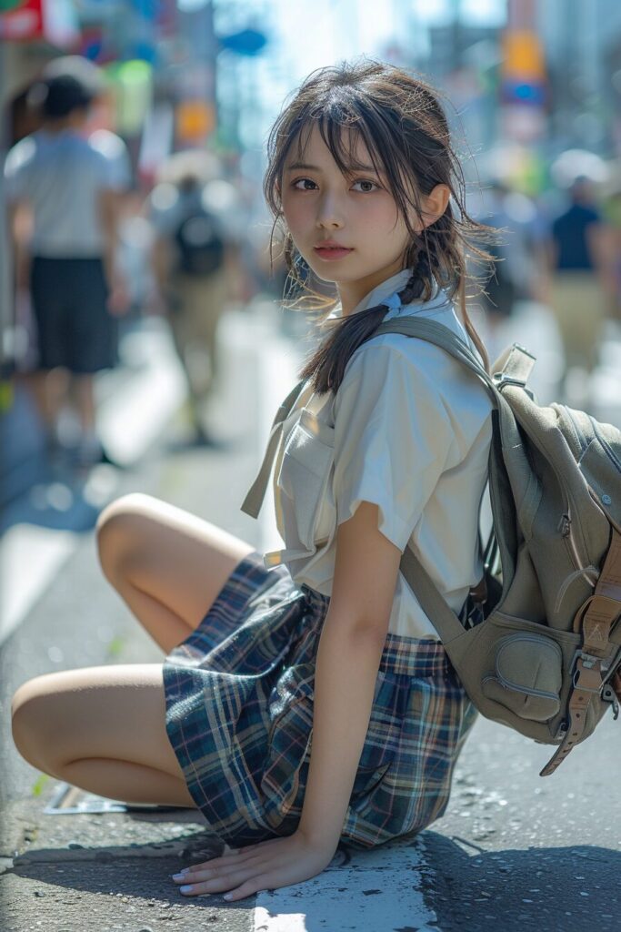 使用したプロンプトはこちら▼ <prompt> Beautiful a Japanese school girl, very short hair, squatting on the road, school uniform, enjoy, Refreshing smiles, Tokyo crowded with people, sunny day, natural light, bright, Composition viewed diagonally , looking away, professional style wide field of view from very low angle shot, looking me, HDR cinematic, --ar 2:3 --style raw --stylize 840