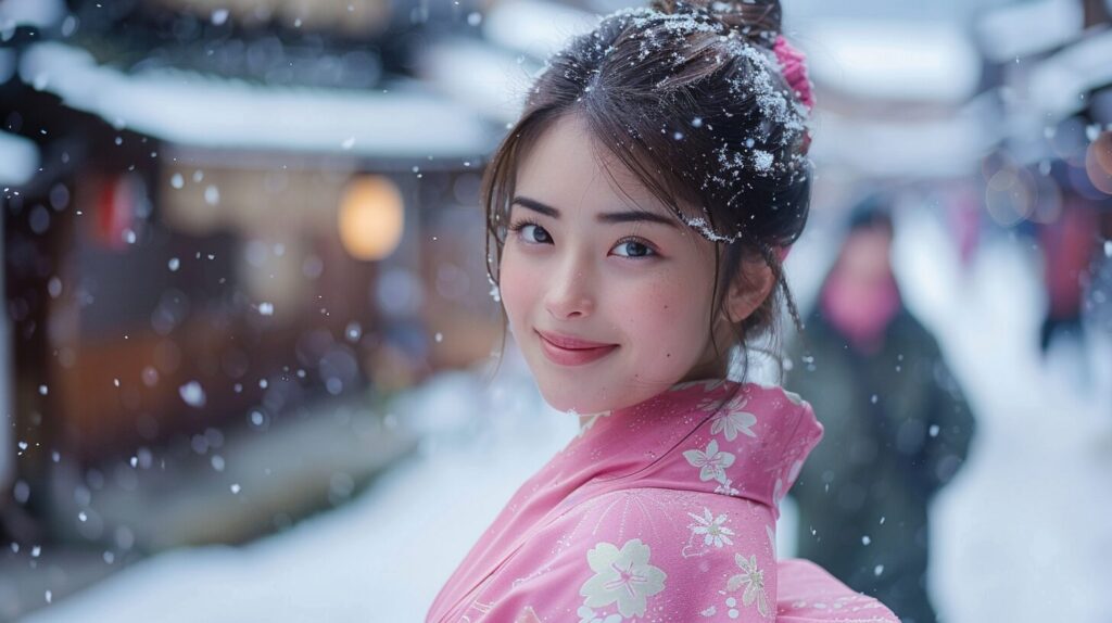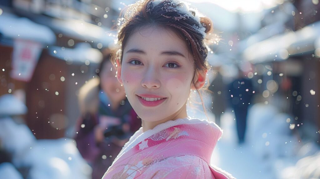 使用したプロンプトはこちら▼ <prompt> In 2024, a beautiful 20-year-old woman stands in the winter snowscape of Japan's Shirakawa-go, wearing a pink kimono and smiling radiantly at the camera. The soft natural and delicate soft lights illuminate her face, with two passersby in the background smiling at her, street photography, Canon R5, Canon AF-S 85mm f/1.2 --ar 16:9 --style raw --stylize 200