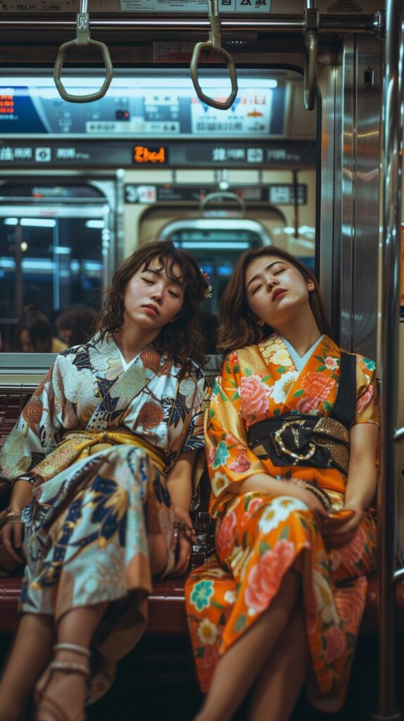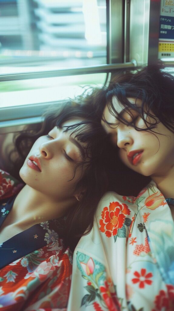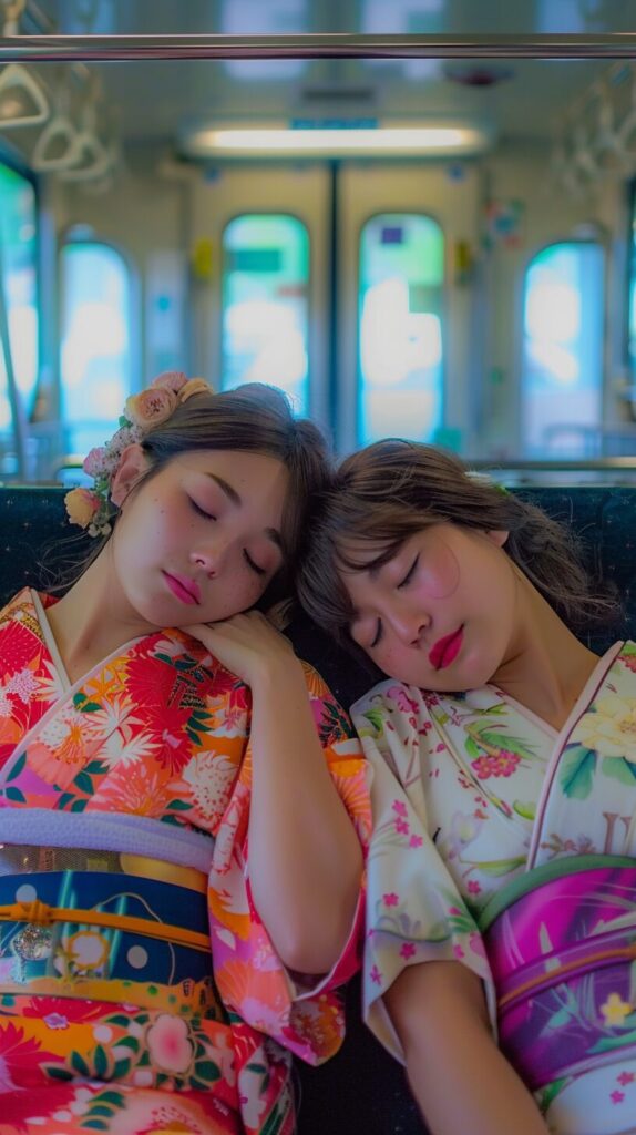 使用したプロンプトはこちら▼ <prompt> Different passengers sitting in subway car two young women sleeping a very beautiful and elegant girl wearing a Japanese yukata --ar 9:16