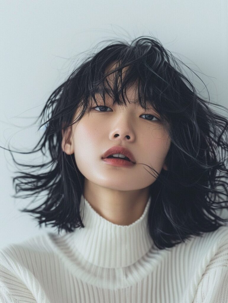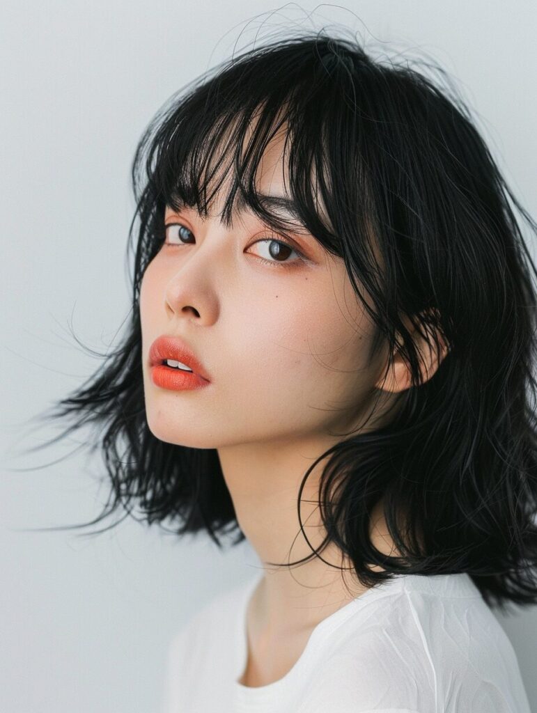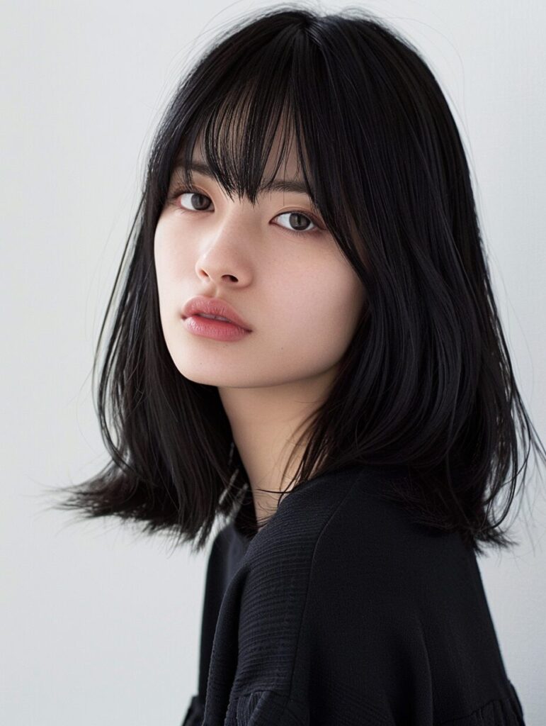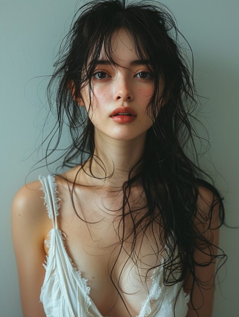 使用したプロンプトはこちら▼ <prompt> A beautiful Asian woman, black shoulder-length hair, bangs, fashion magazine cover, white background --ar 3:4