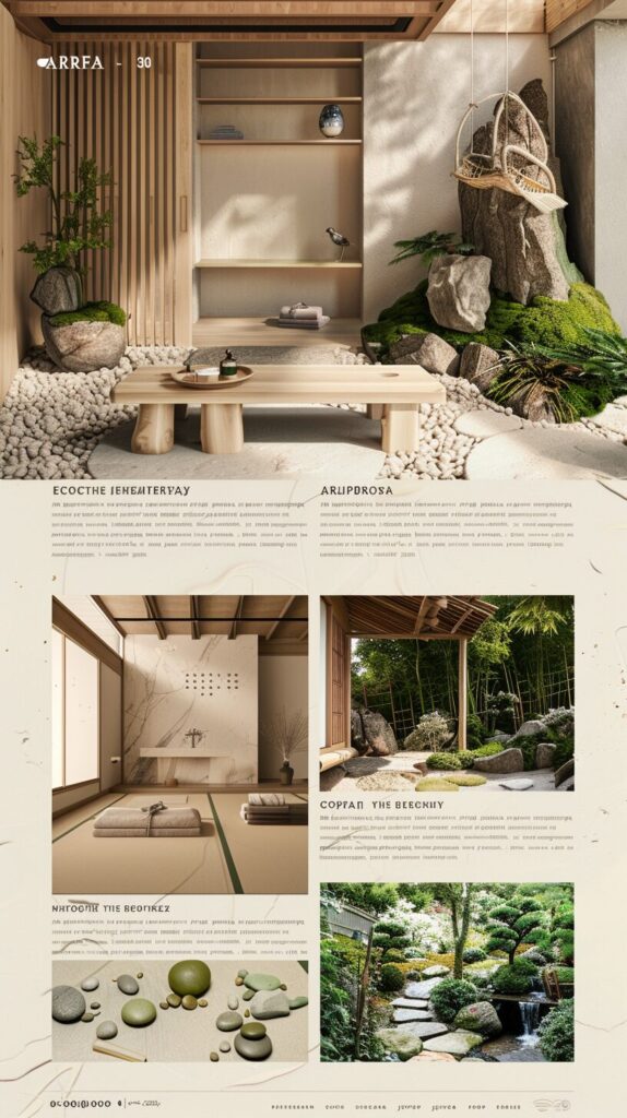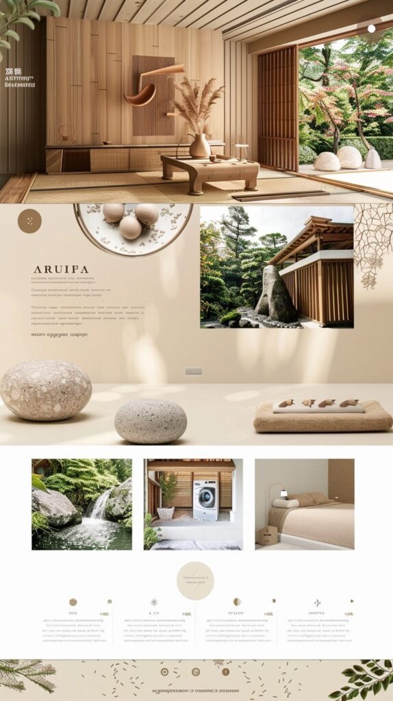 使用したプロンプトはこちら▼ <prompt> Onsen, Create a nature-themed, Russian-language homepage for 'ARUFA', embracing earthy tones and organic textures. Block 1: Feature 'ARUFA' with a natural wood and stone texture theme, alongside a description 'Eco-friendly capsules for washing machines', complemented by a serene image of a Japanese garden and a wooden washing machine model. Block 2: Illustrate capsules nestled in natural environments, representing the seasons with real-life nature imagery. Block 3: Highlight ecological benefits and natural ingredients of the capsules. Block 4: Tell the brand's story through a nature documentary-style video. Block 5: Design a contact section resembling a garden path leading to a traditional Japanese teahouse. Emphasize an eco-friendly, serene design without Japanese characters --ar 9:16 --style raw