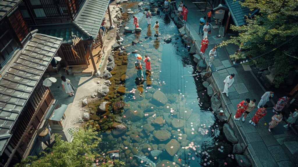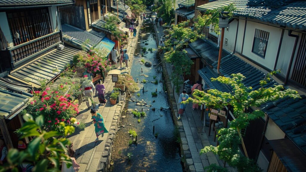 使用したプロンプトはこちら▼ <prompt> architectual bliss in the rural japanese town, concrete slab, hinoki beam and column, clear stream down the village, villagers in kimono ropes and attending festival, aerial photography, street filled with monochomatic flowers --ar 16:9