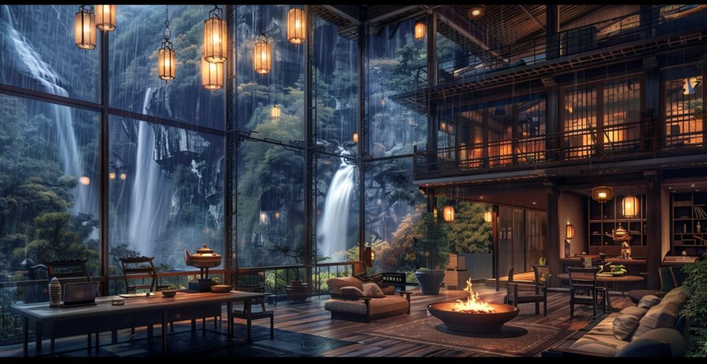 使用したプロンプトはこちら▼ <prompt> elegant asian study area, single floor, with big desk, wood structure living area has large windows and ceilings, tea table around pit fire, heavy rain outside, high in the mountain with waterfall, in the style of anime aesthetic, dark, moody landscapes, 32k uhd, outdoor scenes, hanging lights, oriental, wood, uhd image --no wet floor, fire directly on the floor, unaligned structure columns, no patterned carpet --ar 64:33