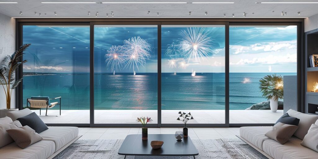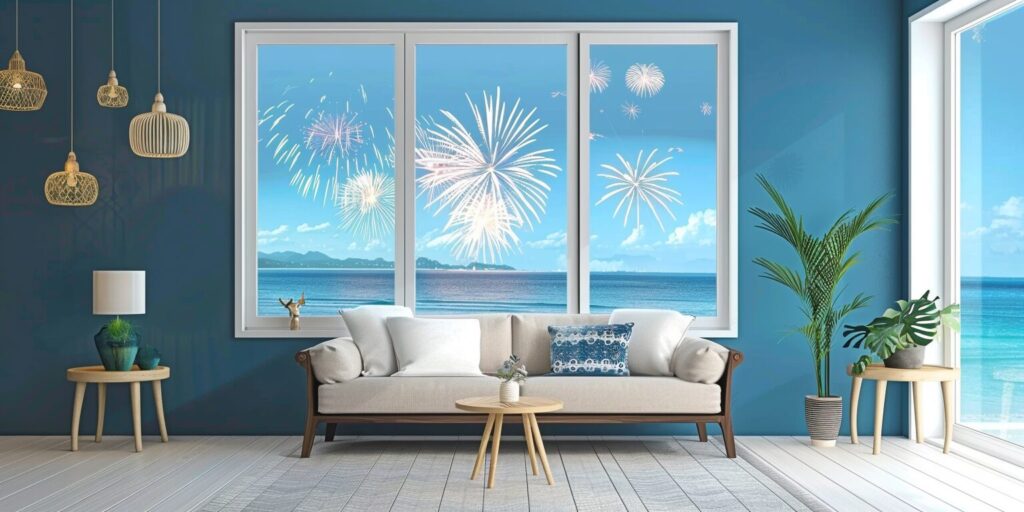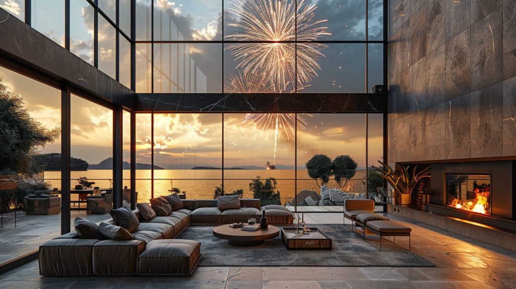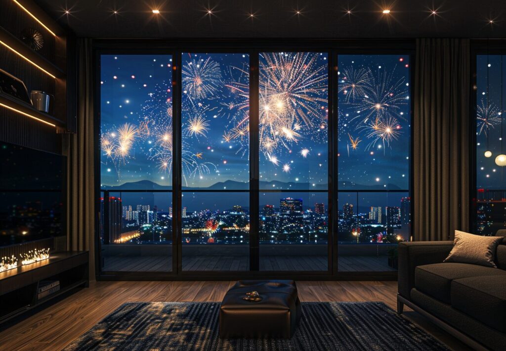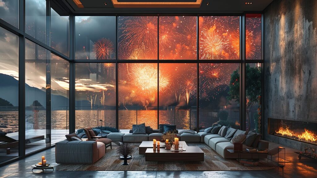 使用したプロンプトはこちら▼ <prompt> Large fireworks, pure black background, HD, sliding window,a large black aluminum sliding window installed in a huge wall, luxuary room --ar 16:9 --stylize 700