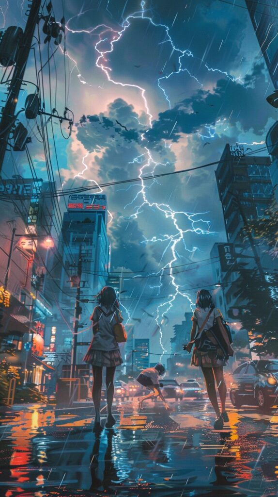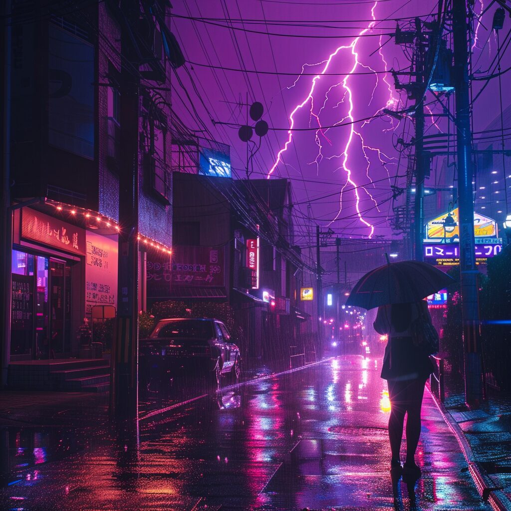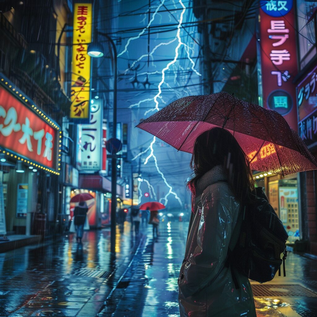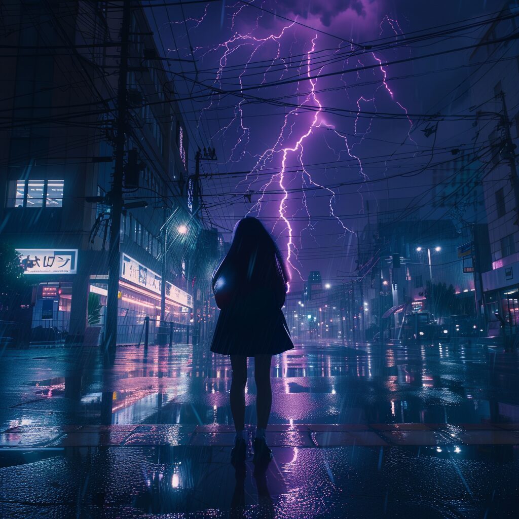 使用したプロンプトはこちら▼ <prompt> multiple big lightning strike on the city sky, in the style of electric color, 8k resolution, accurate and detailed, beatiful japanese girl, night scene in tokyo with rain, kodachrome --style raw