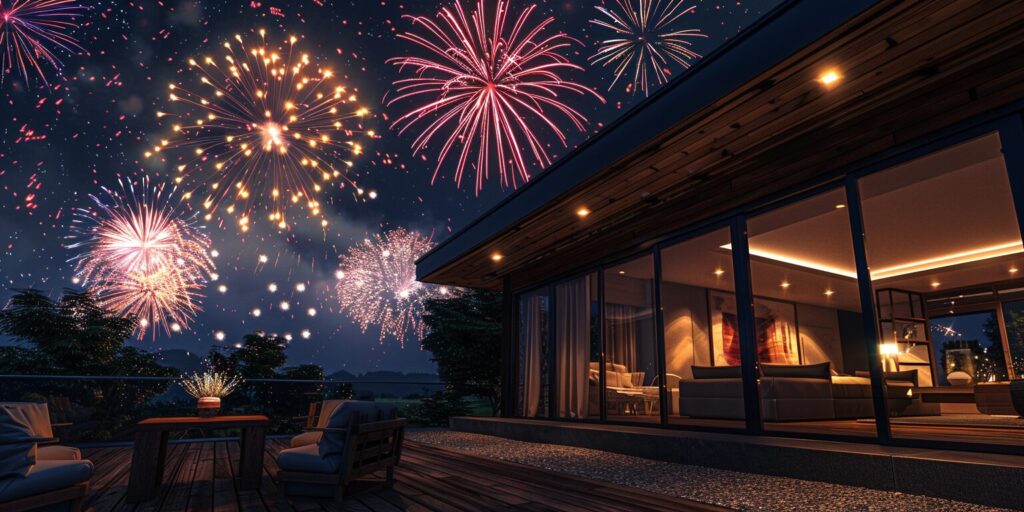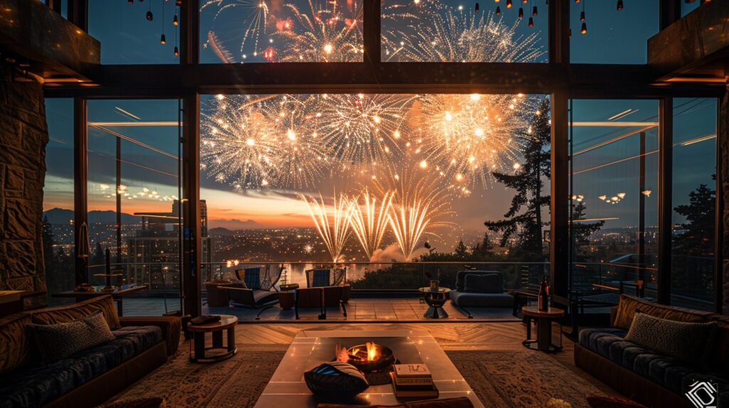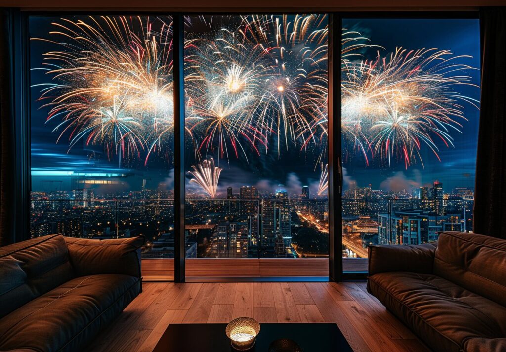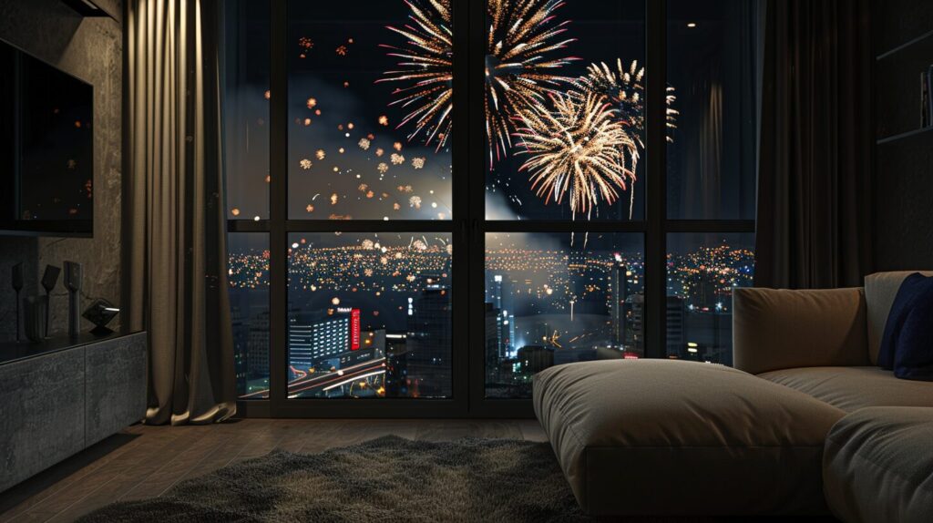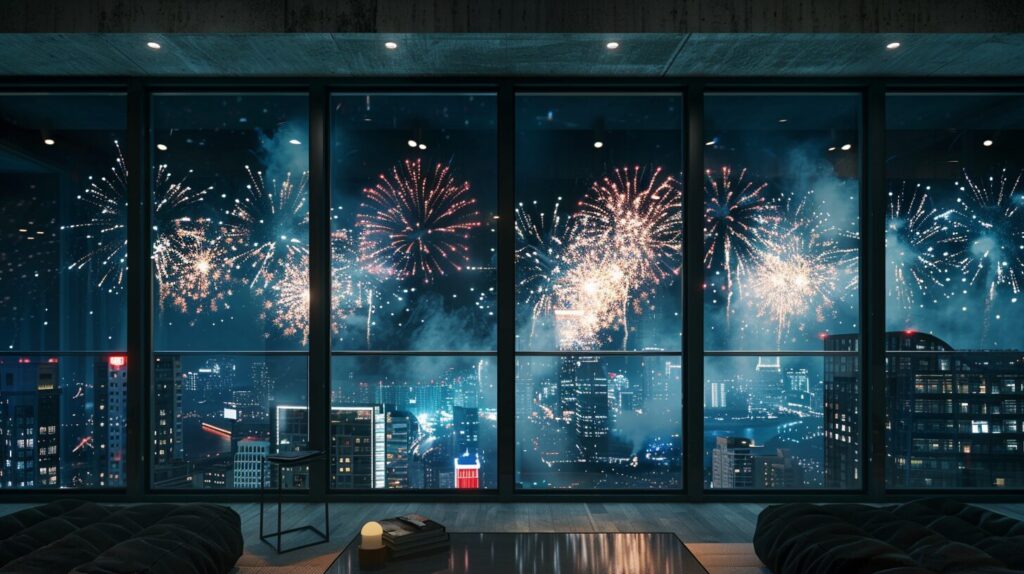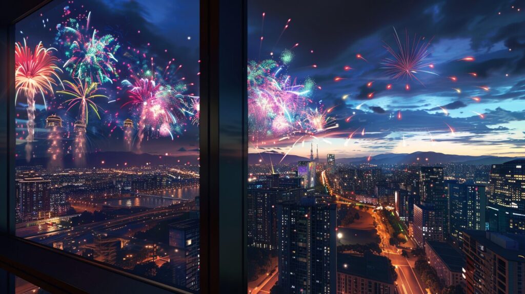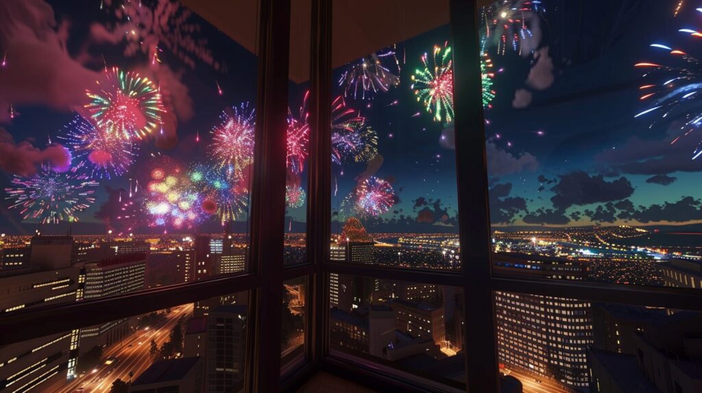 使用したプロンプトはこちら▼ <prompt> fireworks set off on a dark night with smoke, in the style of cluj school, dark silver and dark emerald, joyful and optimistic,wallpaper design, A high-resolution octane render window with a large glass pane centered on a gray-beige Concrete wall, overlooking a city view, in the living room, Stylish, Sophisticated, Modern, Realistic, Well-suited for the large city, Indirect lighting, hyper-detailed, --ar 16:9