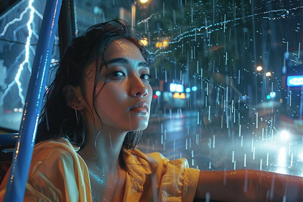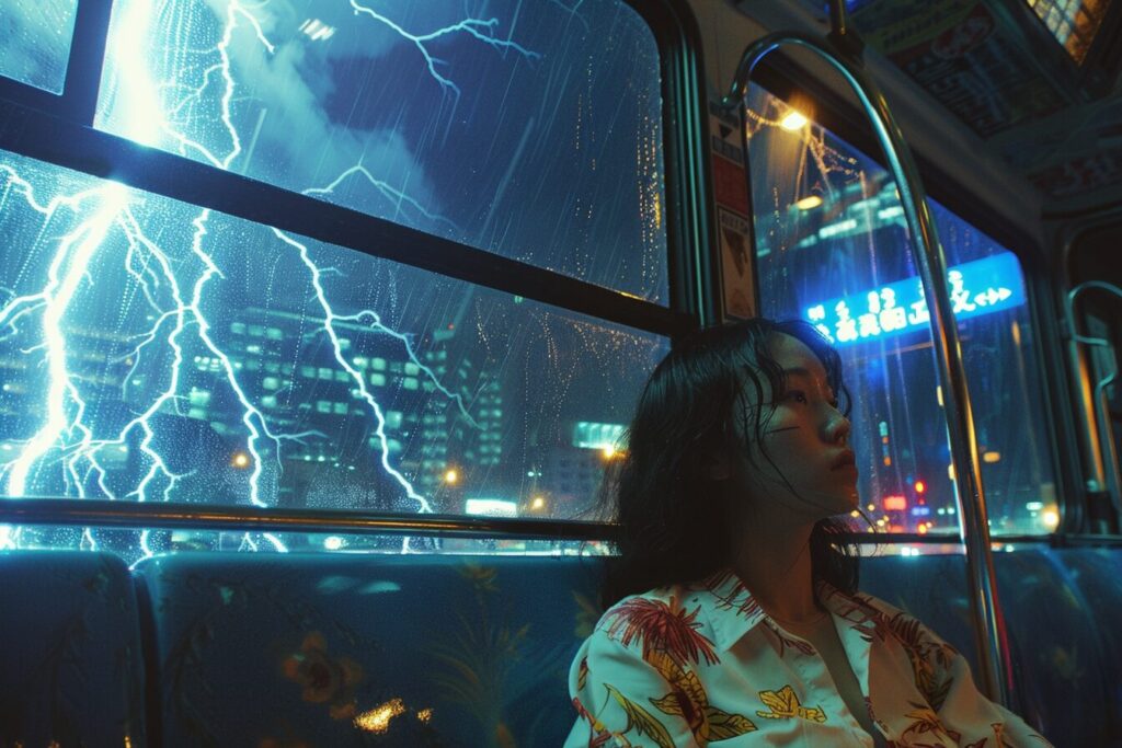 使用したプロンプトはこちら▼ <prompt> multiple big lightning strike on the city sky, in the style of electric color, 8k resolution, accurate and detailed, Kodak disposable camera photo, a asia female sitting on a bus, raining out side, looking away, wearing clean shirt --ar 3:2