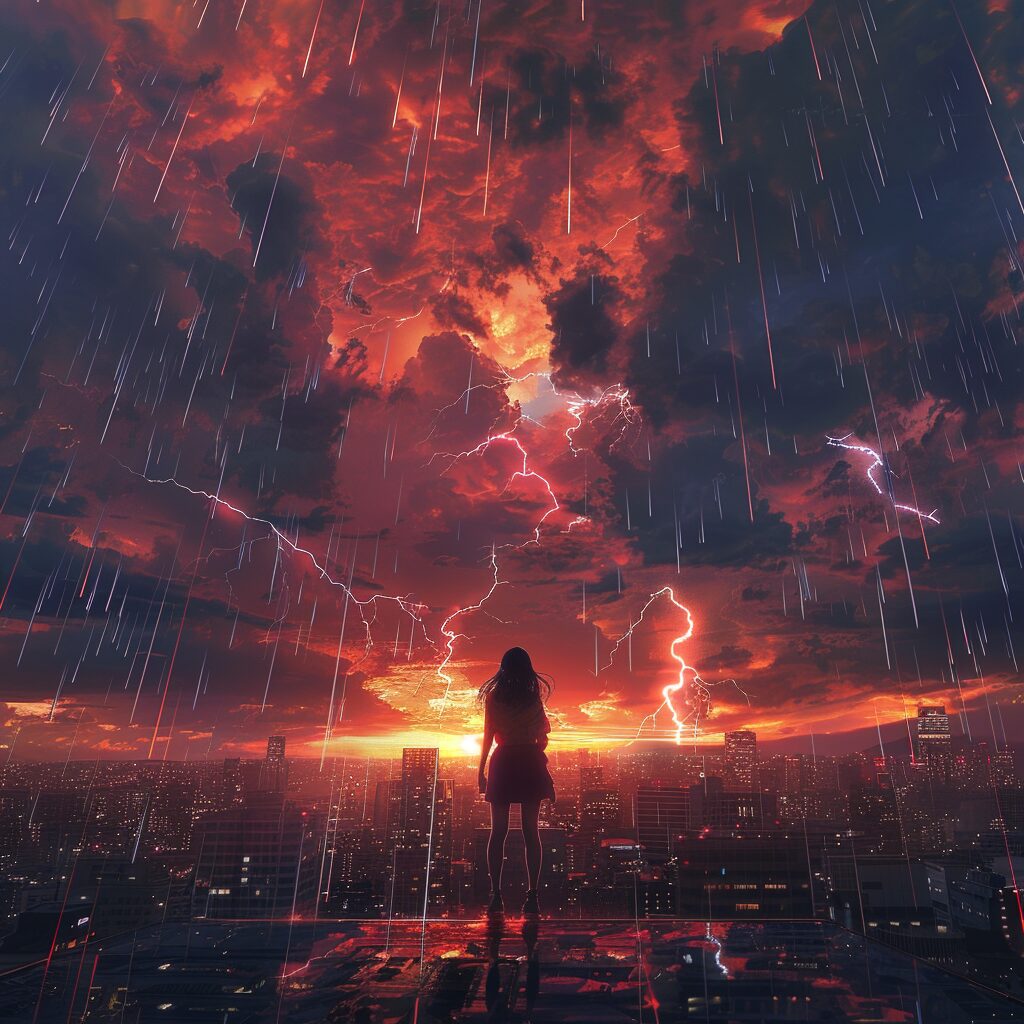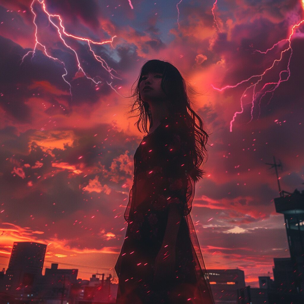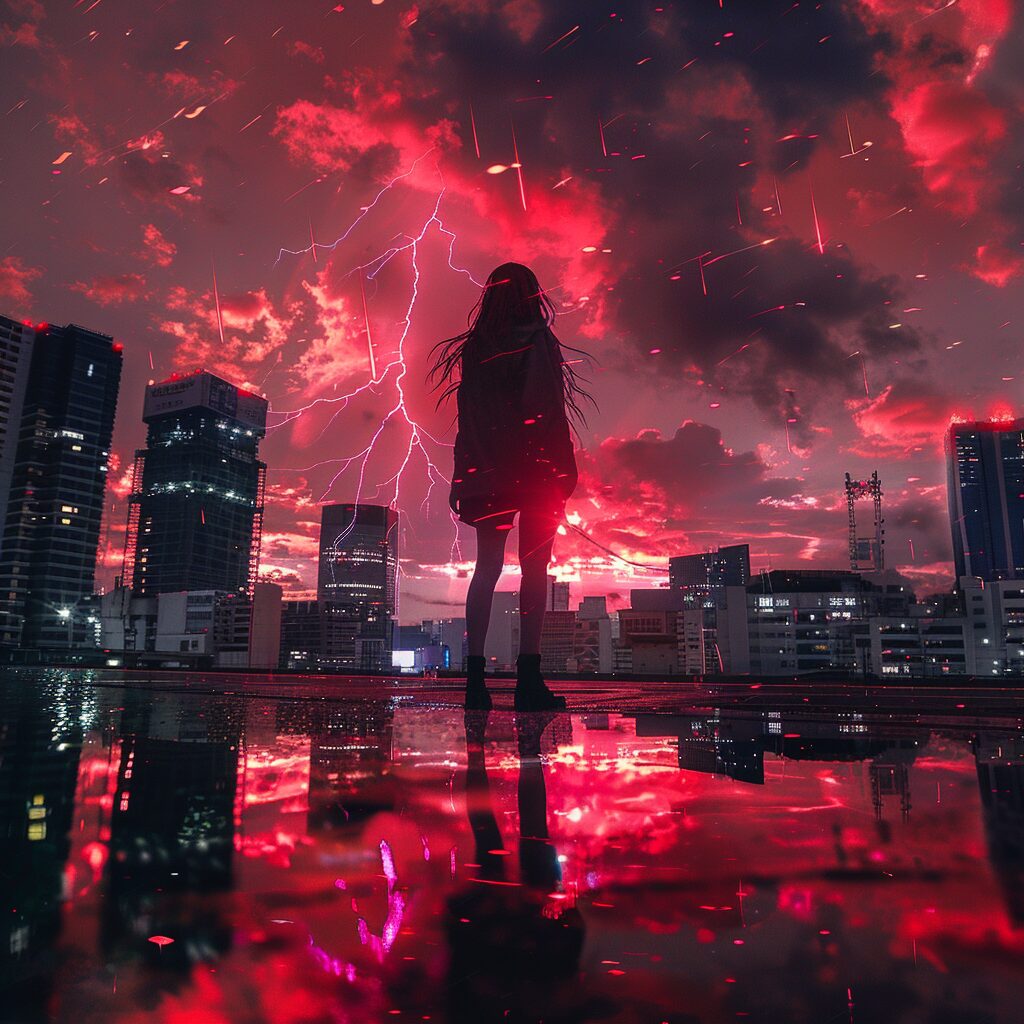 使用したプロンプトはこちら▼ <prompt> multiple big lightning strike on the city sky, in the style of electric color, 8k resolution, accurate and detailed, art,20 years old japanese woman,full body shot,Low Angle,City,after rain, red sky,sunset,glitter
