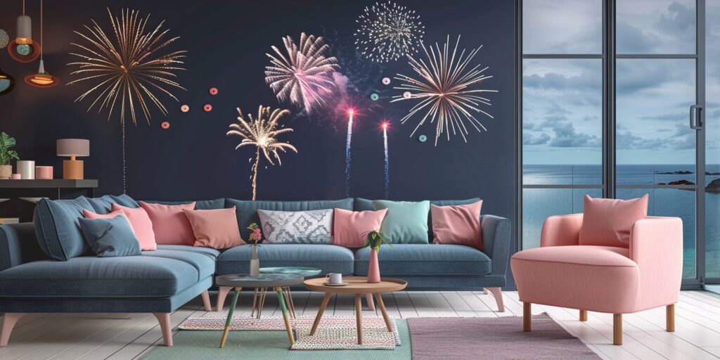 使用したプロンプトはこちら▼ <prompt> black background, fireworks, Design nordique d'intérieur d'un salon moderne , vue sur la mer avec des vagues, grande baie vitrée , style nordique, bleu et blanc et vert et rose , grands murs hauts, couleurs pastel --ar 2:1 --style raw