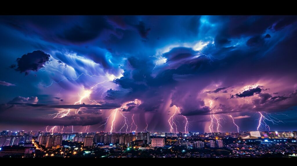 使用したプロンプトはこちら▼ <prompt> multiple big lightning strike on the city sky, in the style of electric color, 8k resolution, accurate and detailed, flickr, associated press photo, atmospheric urbanscapes, azure --ar 16:9