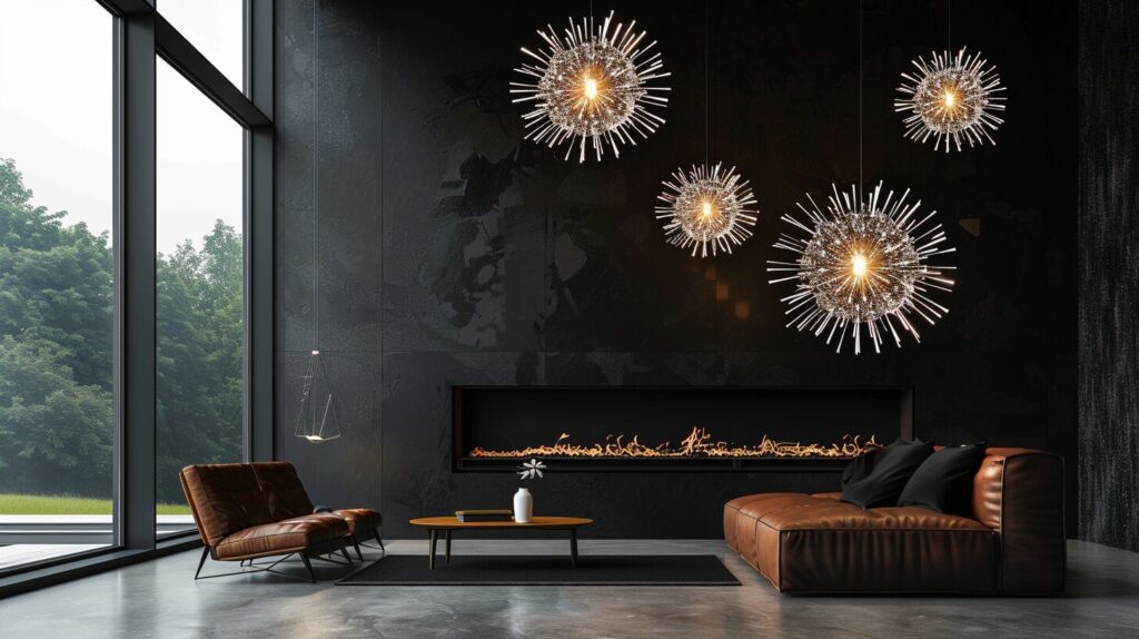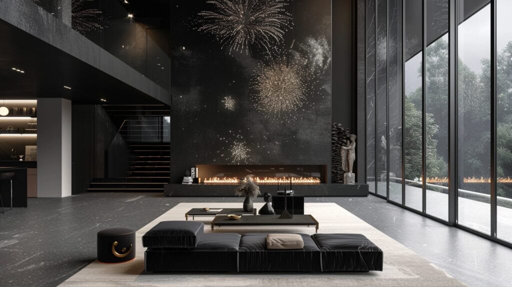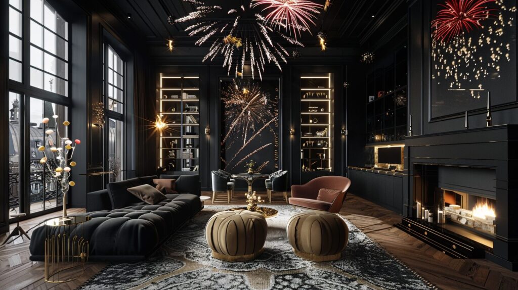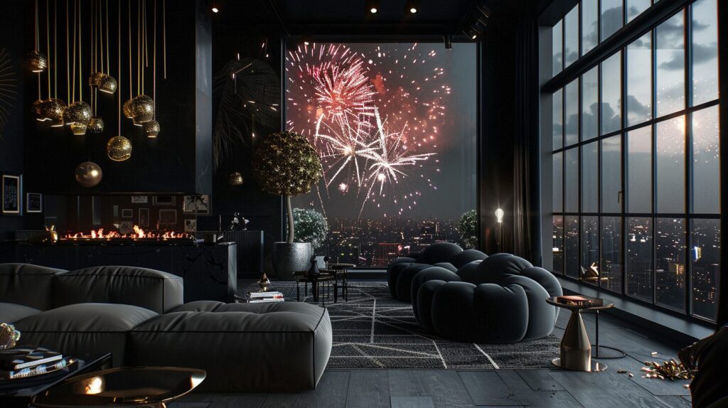 使用したプロンプトはこちら▼ <prompt> black background, fireworks, interior design, the perfect mix between rococo style and modern scandinavian design. Large floor to ceiling windows in black colors, coloful fireworks, --ar 16:9