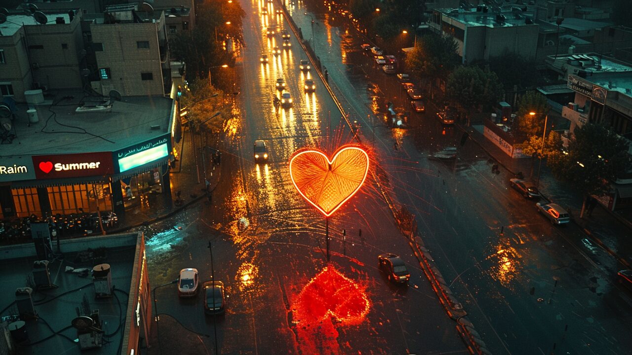 使用したプロンプトはこちら▼ <prompt> tehran city in rain of red heart, rain of heart from sky, top view, --ar 9:16