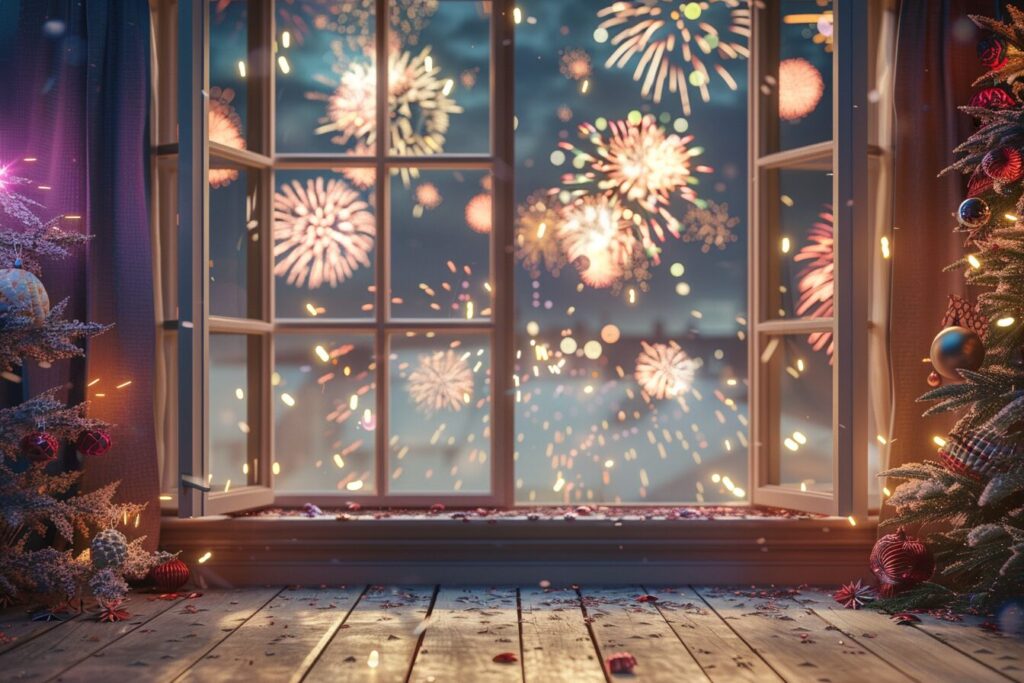 使用したプロンプトはこちら▼ <prompt> 3D cartoon game scene, fireworks all over the sky, festive New Year atmosphere,Blender rendering, playful color, Photo of an open window in a rich interior with flowers standing on the windowsill, shot on canon d6 --ar 3:2