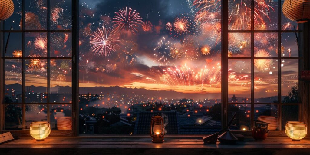使用したプロンプトはこちら▼ <prompt> fireworks in the sky at night. They are all over the sky, and they are very big. The fireworks are colorful. Today is the Lantern Festival, Front view of a big window with small built-in coffee station. Modern zen design with black wood accents, Night sky with beautiful fireworks --ar 2:1 --stylize 250