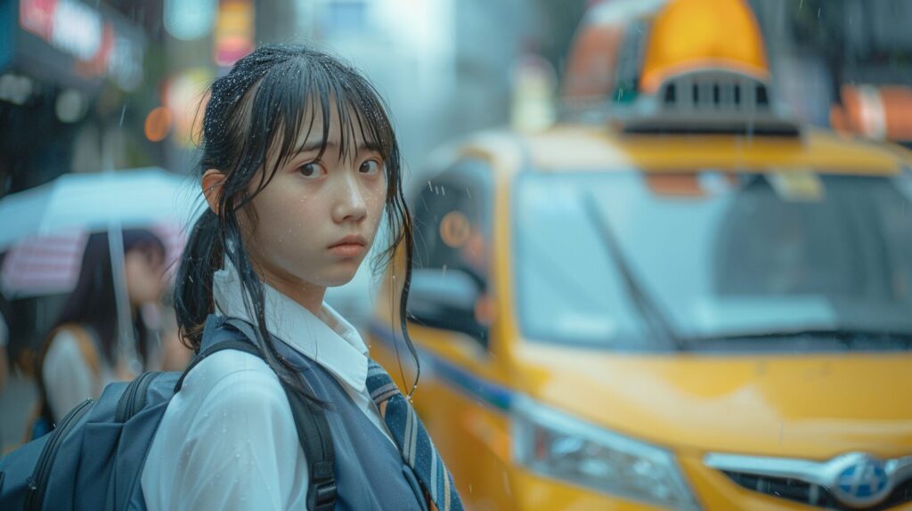 使用したプロンプトはこちら▼ <prompt> 18-year-old female student in student uniform, standing in the street to stop a taxi, in traffic jam, with innocent expression, heavy rain without umbrella, full body photo, clear background, Taiwan, Taipei --ar 16:9