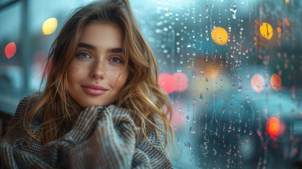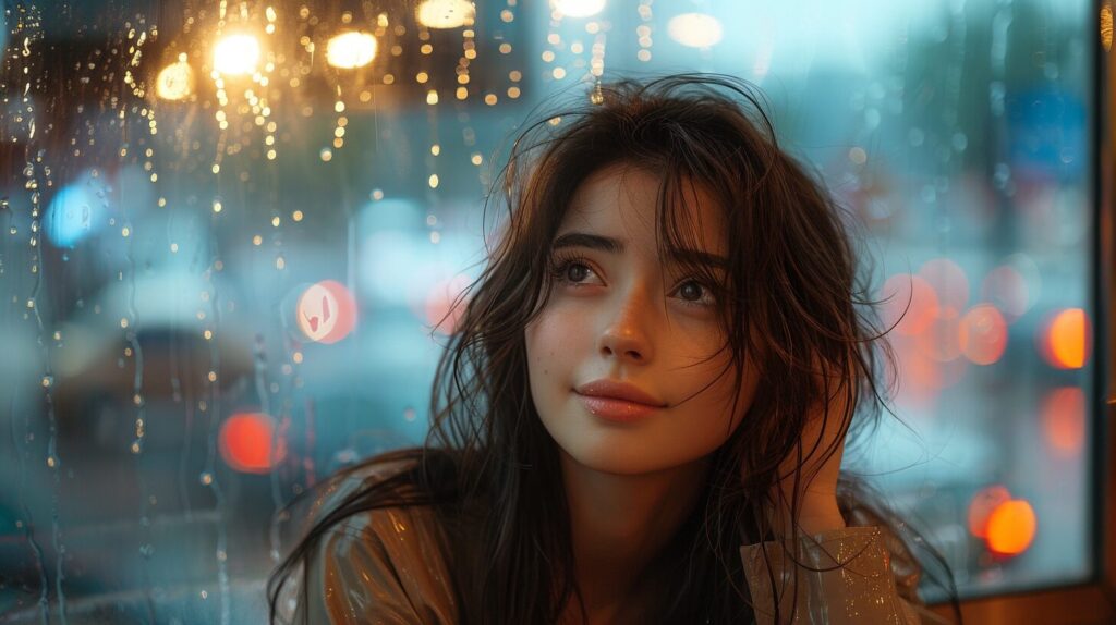 使用したプロンプトはこちら▼ <prompt> documentary photography , A cute, long-haired woman is sitting and sipping coffee in a cafe. She releases her emotions by looking out the window. Outside, the evening atmosphere is set with a light rain falling, traffic jams, and the night lights shining. The focus is on her face. --ar 16:9 --stylize 750 --iw 2