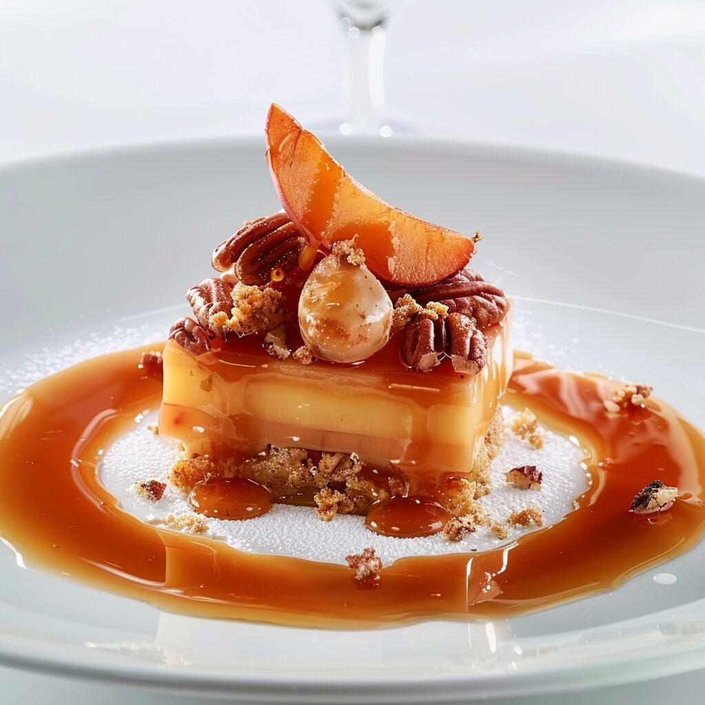 A dessert made of caramel, speculoos, pecan and tatin apples, geometric, white plate, white background, michelin star, high class, hyper detail 3d max render, elegant, delicious, cinematic, color grading, depth of field, hyper - detailed, beautiful color coding, crazy detail, editorial photography, photorealistic, UHD, HDR, HD, natural lighting, Canon EOS R3, f1. 4, ISO 200, 1160s, 32K, RAW, Pro Photo RGB, bokeh, lens flare, High Quality, 400MP, Megapixel, Super Resolution, Michelin star presentation of the dessert --style raw --v 6.0