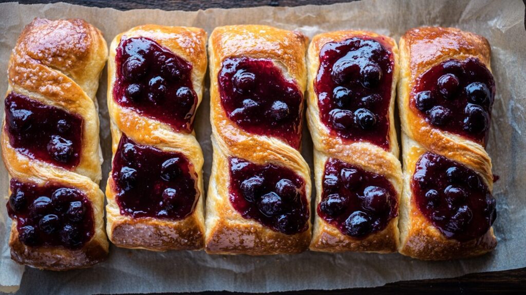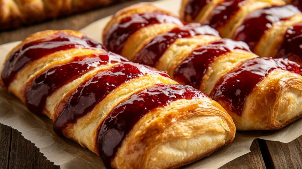 A professional food photograph of five cherry danishes on parchment paper, each featuring an extra-large strip-shaped bun filled with jam and cut into four strips. The tops are shiny, very soft, golden-brown, and buttery. The background is a dark wood tabletop, and the angle shot is taken from above, capturing a close-up view of all five pastries. In the background, one slice of baked coffee brioche is arranged in lines. The image is highly detailed, taken with a Nikon D850 camera with a Nikkor 24-70mm f/3 lens, focused by a product photographer for photorealistic quality, Sweet potato pastry --stylize 50 --ar 16:9 --v 6.1
