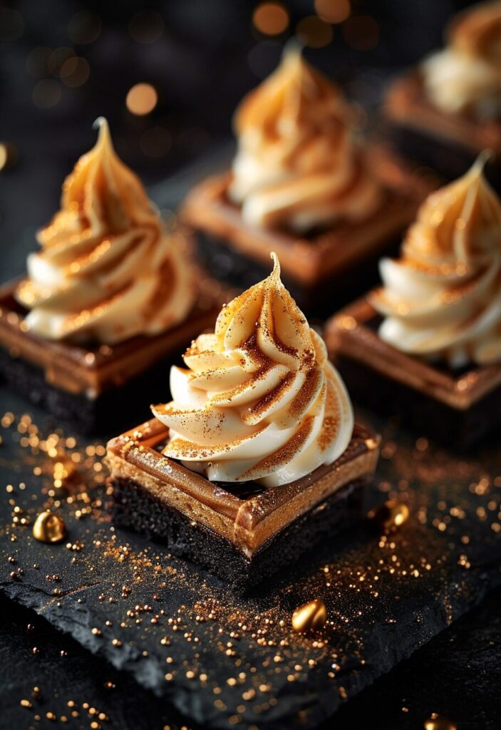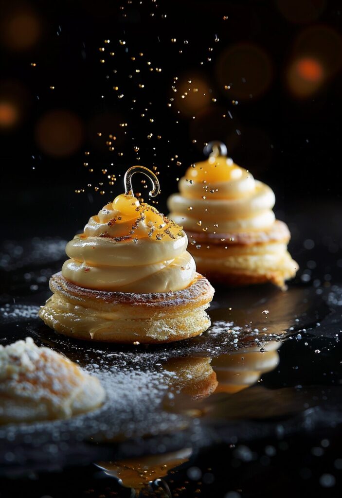 Food photography, Quith-Pastry Delights, delicate pastries filled with a sweet, rich cream and topped with a thin layer of shimmering, edible gold, on a slate of pure obsidian, in a luxurious, dark drow tavern --ar 11:16 --v 6.0