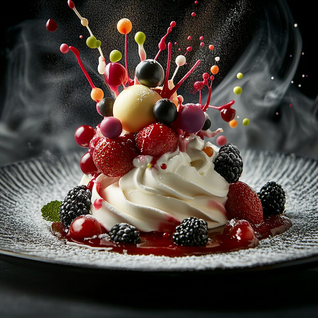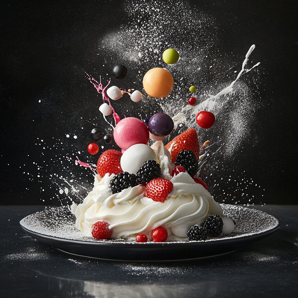 Food photography, meringue dessert with strawberries, blackberries and multi-colored spheres --v 6.1