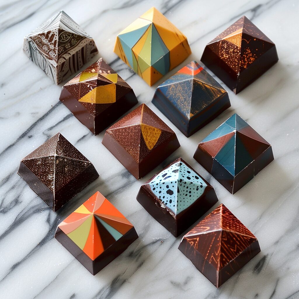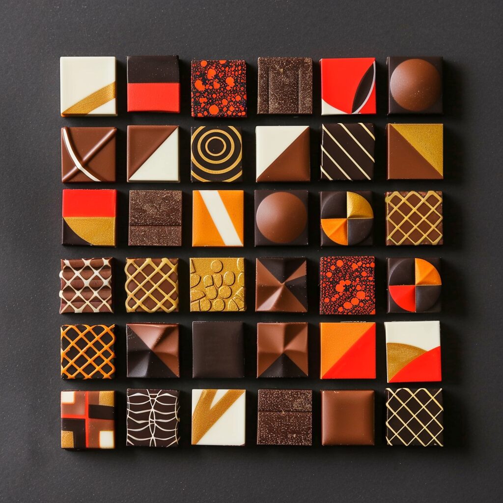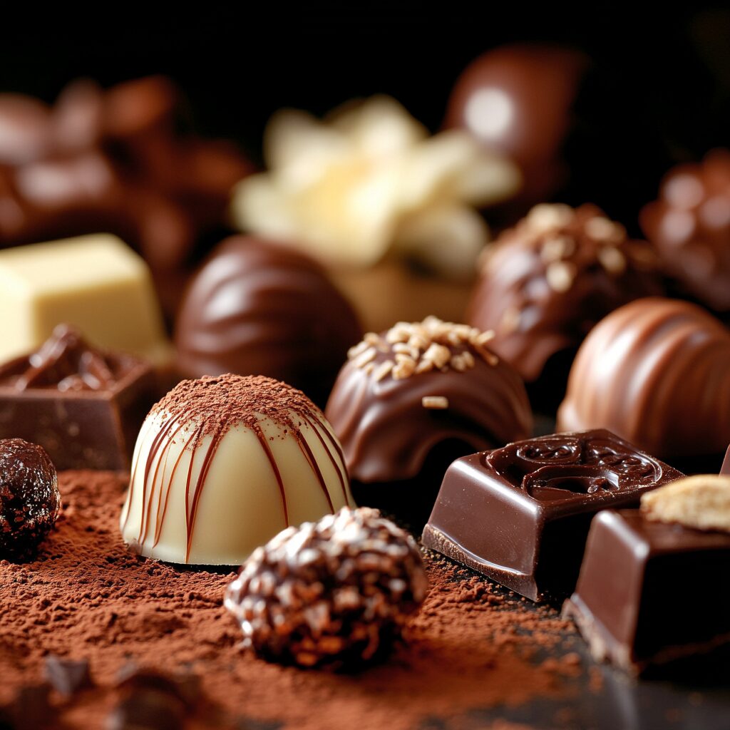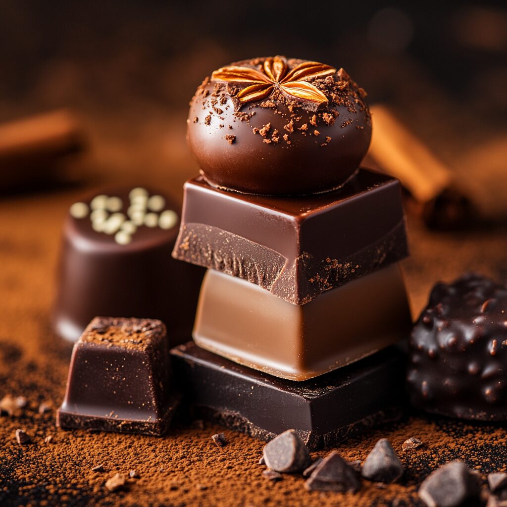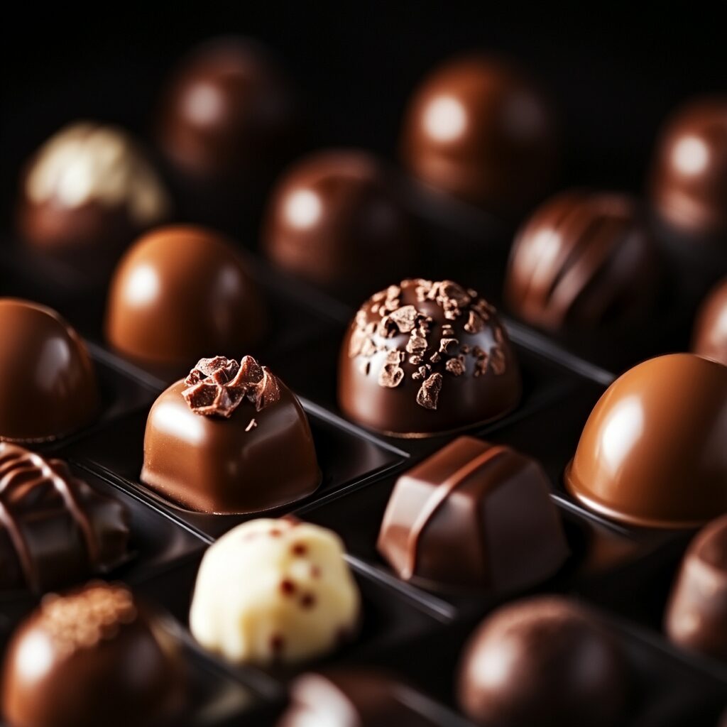 Luxury chocolate pralines, with an atmosphere of chocolate in the background --v 6.1