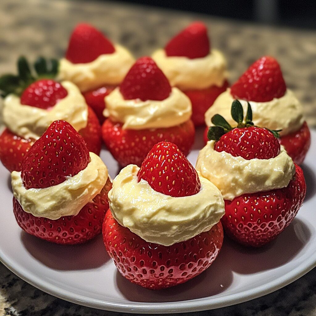 RECIPE NAME: Cheesecake Deviled Strawberries | Amateur photo from reddit, taken with an iPhone 15 Pro. | SHOT TYPE: Macro Shot Focus on the details --v 6.1
