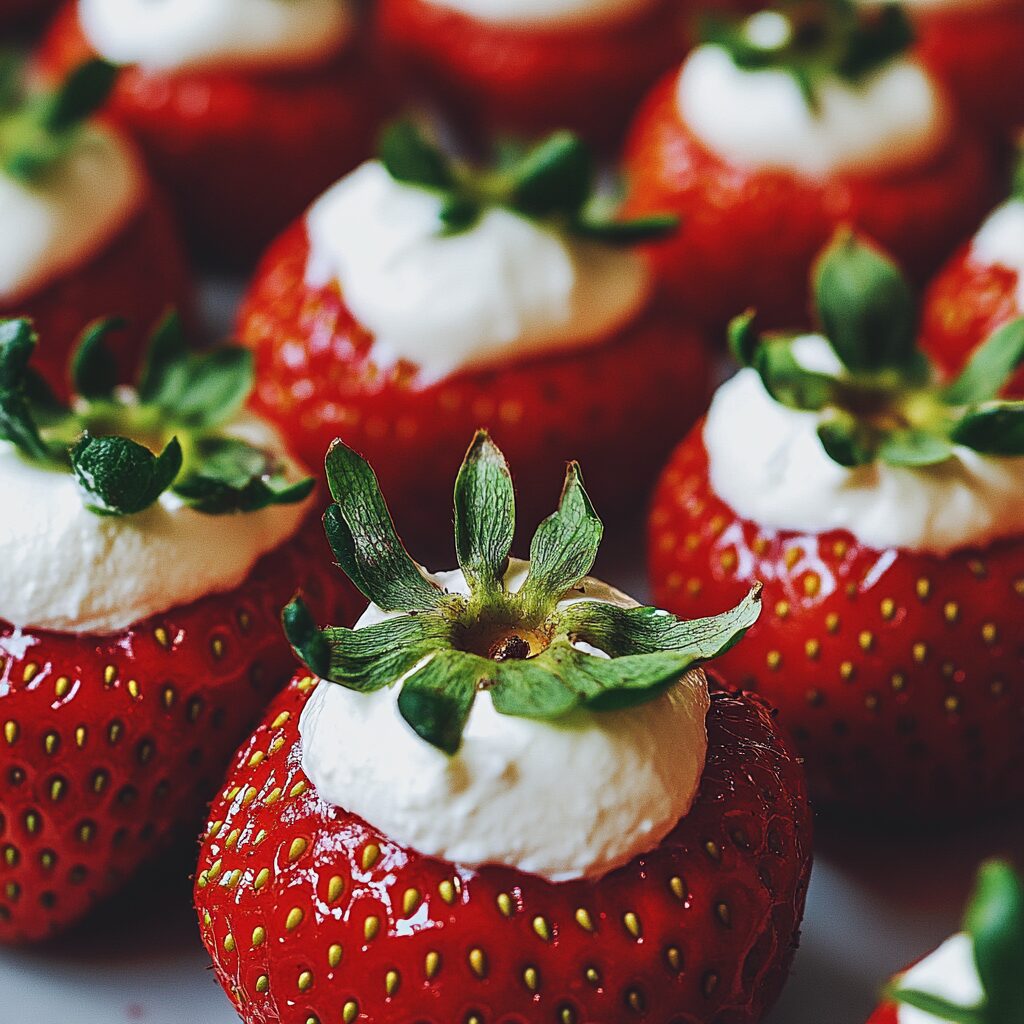 Close-up Shot side-Top view | EMOTION: Tempting I SCENE: Cheesecake Stuffed Strawberries | RECIPE: Ingredients: 8 ounces cream cheese, softened 1/4 cup powdered sugar 1/4 cup sour cream 1/2 teaspoon vanilla extract 20 large strawberries, washed Instructions: Prepare Cheesecake Filling: In a large mixing bowl, beat the softened cream cheese until smooth. Add the powdered sugar, sour cream, and vanilla extract. Beat well until the mixture is creamy and smooth. Prepare Strawberries: Cut the top off each strawberry to remove the green stem and leaves, creating a flat surface so the strawberries can stand upright. Use a sharp knife to cut each strawberry in half vertically from the point down close to the base, but do not cut all the way through. This should leave the base intact. Make 3 additional cuts in each half, perpendicular to the first cut, to create a total of 6 "petals". These cuts should go from the top to near the base, allowing the strawberry to fan out like a flower. Fill the Strawberries: Use a small spoon or your finger to gently press down inside each strawberry half to create a small hollow for the filling. Transfer the cheesecake filling into a piping bag fitted with a star tip (or any desired tip). Pipe the cheesecake filling into the center of each strawberry, filling enough that the petals flare out and the filling is visible between the petals and on top of the strawberry. Serve: Serve the cheesecake stuffed strawberries immediately for a fresh and delicious treat. For a firmer texture, chill the stuffed strawberries in the refrigerator for 1-2 hours before serving. These Cheesecake Stuffed Strawberries make for a delightful dessert or party treat, combining the freshness of strawberries with the creamy richness of cheesecake filling. Enjoy!