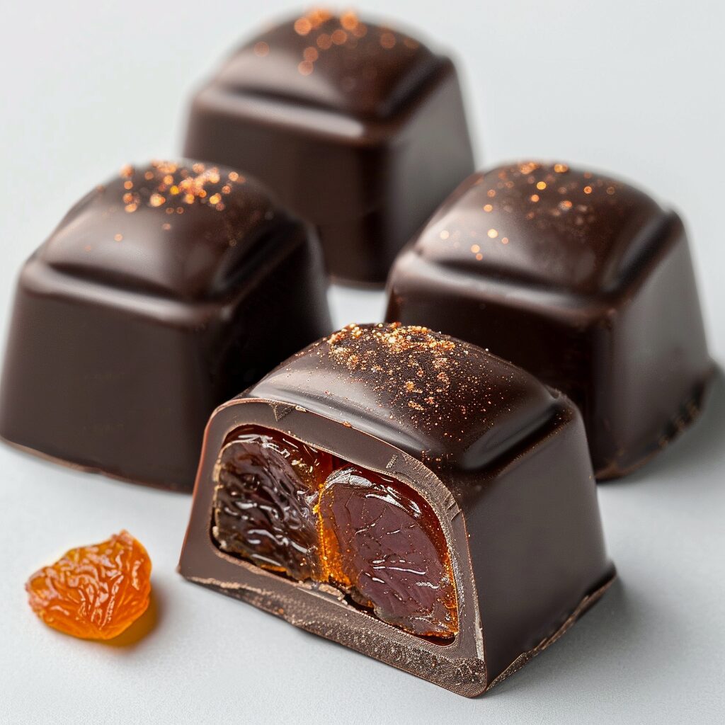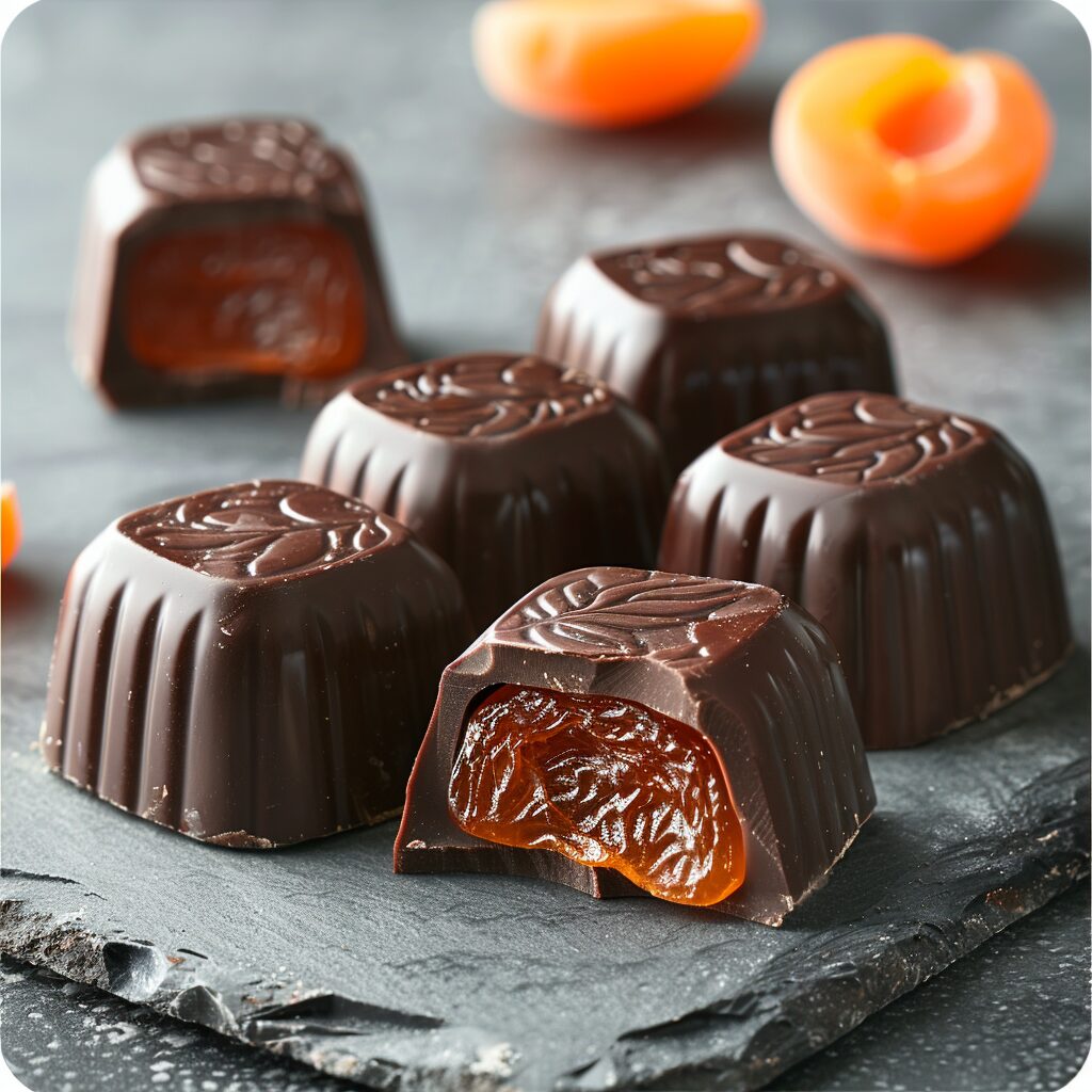 cut chocolate candies stuffed with dried apricot,studio light, clean background, detailed--style raw --stylize 250 --v 6.0