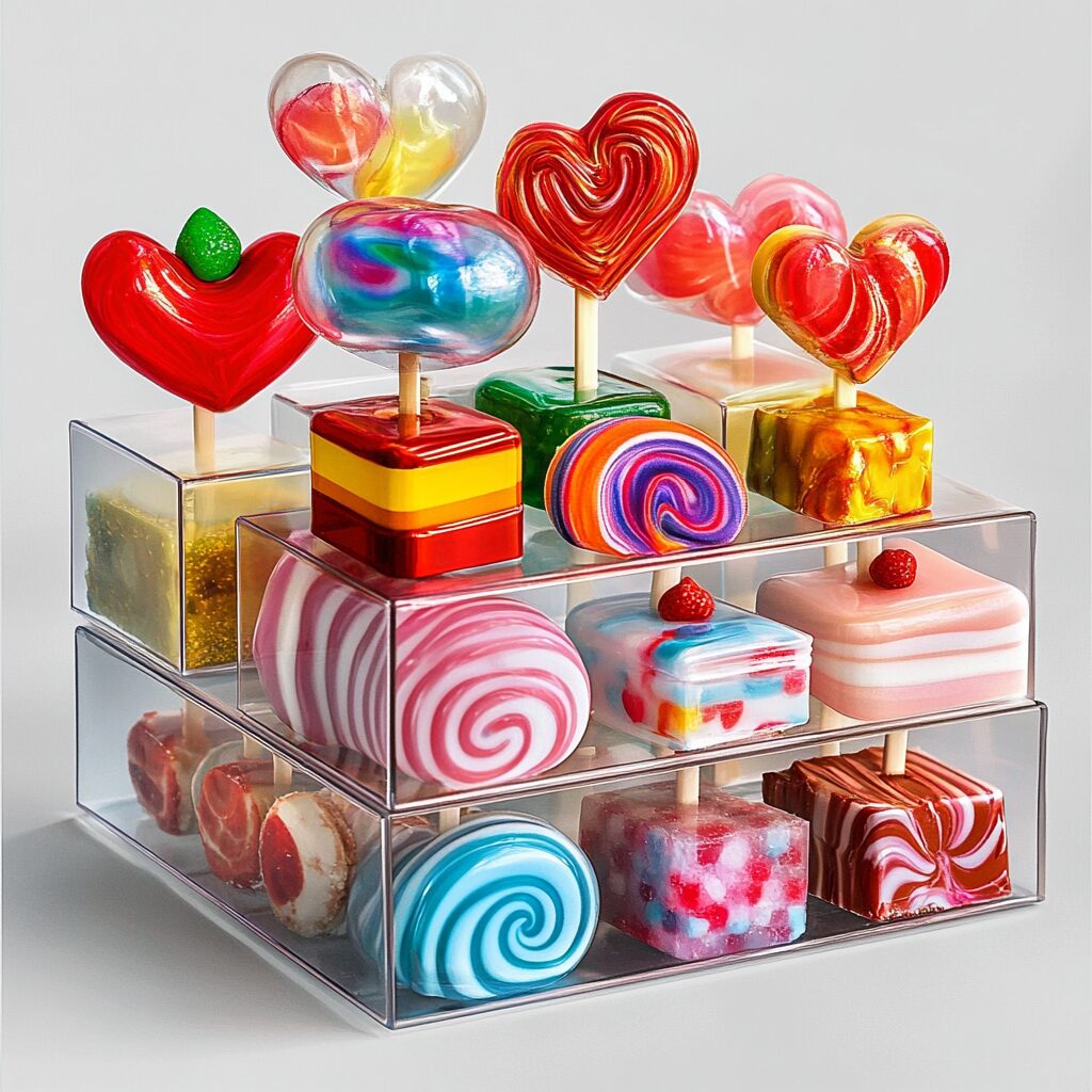 a poster of delicious looking petit fours in all kinds of colors, complimentary artstyle, picture by helnwein, --ar 48:67 --v 6.0