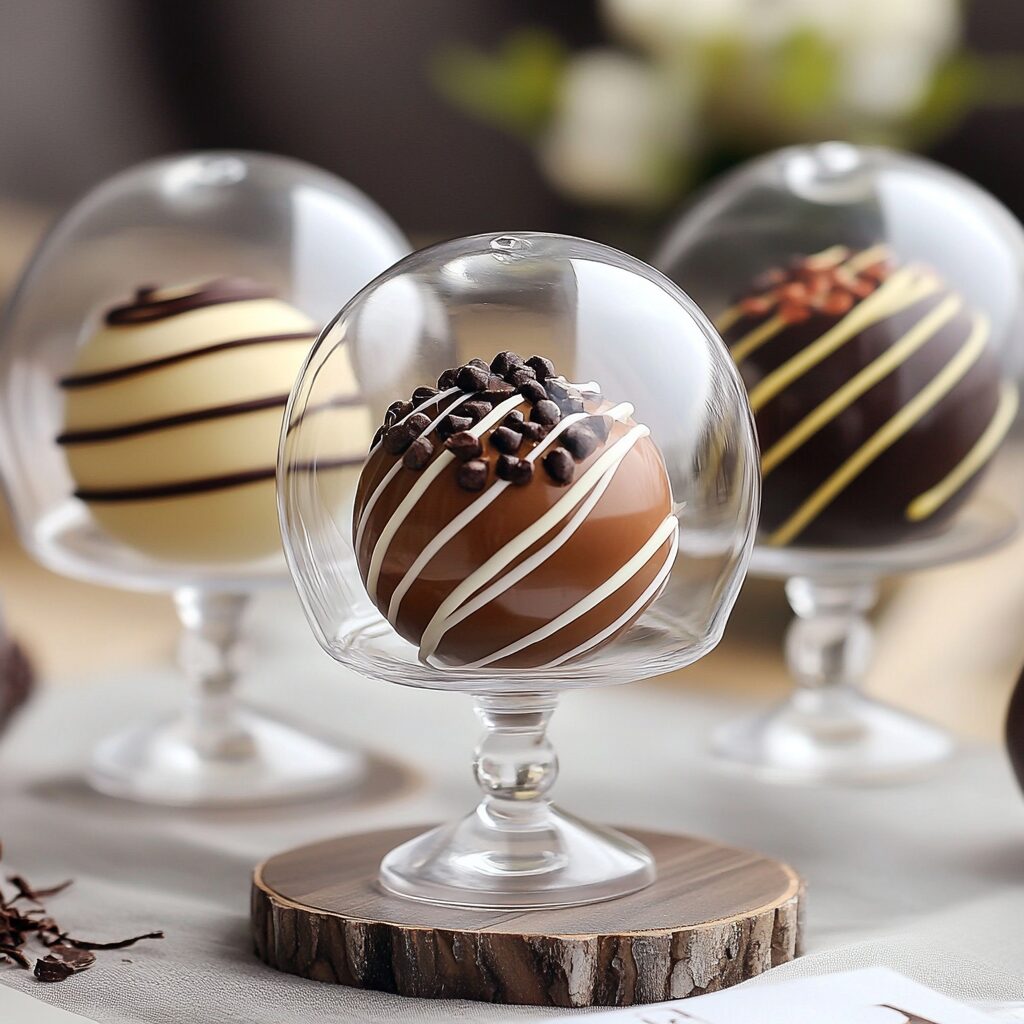 A photo of two sphere-shaped chocolate pralines. The texture is glossy and smooth. There's an open side showing swirls inside the ball-shaped chocolate pralines. White background. High resolution. --ar 91:87 --stylize 750 --v 6.1