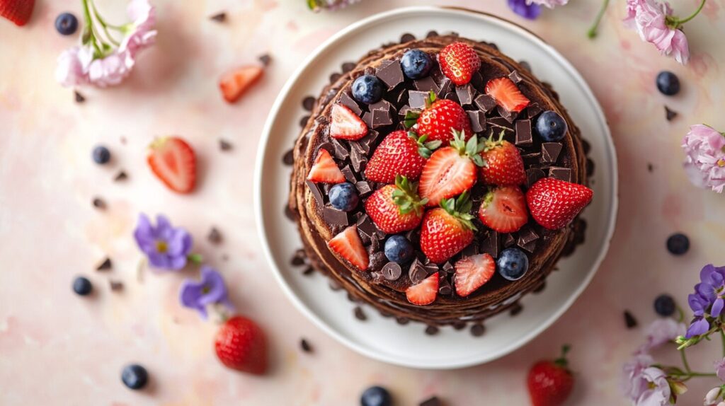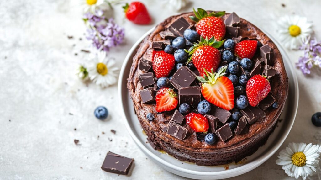 gateau chocolat, chocolate pancake with strawberries, blueberries and chocolate pieces on top, surrounded in a small white bowl, flowers around the cake, on a light background, food photography, cozy atmosphere, realistic photo - --ar 16:9 --v 6.1