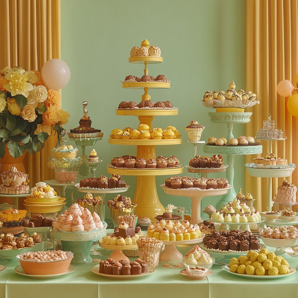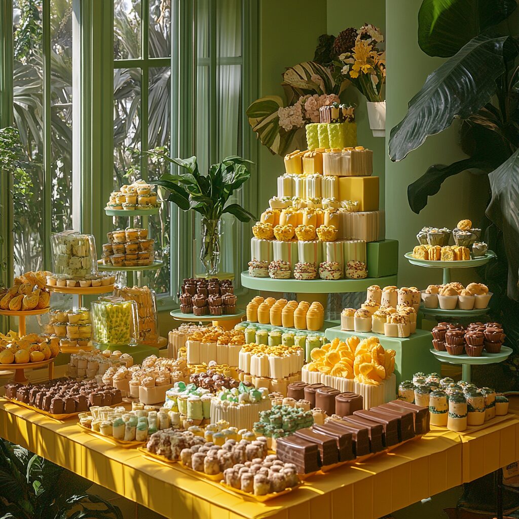 table covered with chocolates, surrounded by chocolate, in the style of Wes Anderson, interesting location, Pastel Sunny Yellow, Spring Green and Medium Green Colours, quirky costume design --ar 1:1 --style raw --stylize 250 --v 6.1