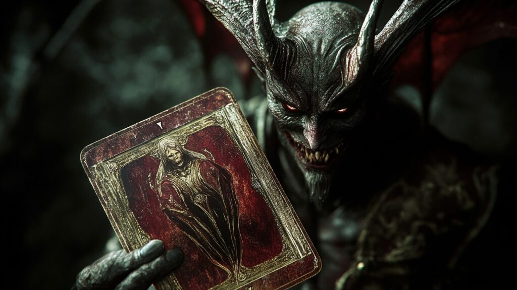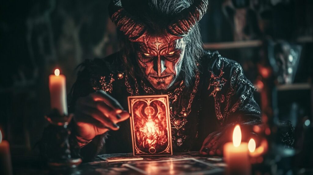 dark art image of the devil, fantasy style tarot card, cinematic lighting --ar 16:9 --v 6.1