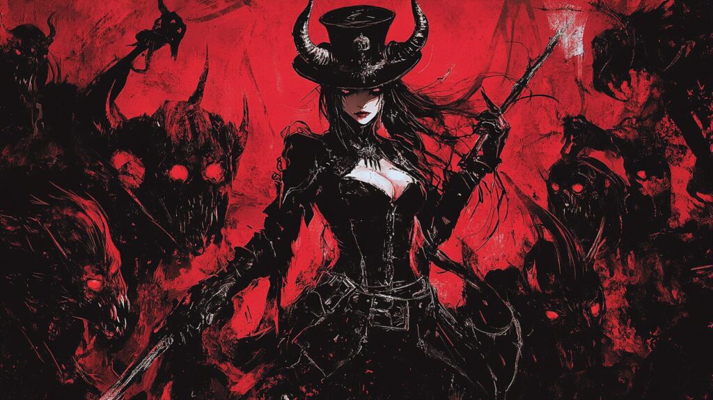 Grimoire devils Agares, Dark Queen from a death metal album cover art. She is holding her sword and has horns on a top hat. Demonic creatures surround her in the background, against a dark red background with black details. Full-body shot, in the style of Yoji Shinkawa and Kentaro Miura. --ar 16:9 --v 6.1