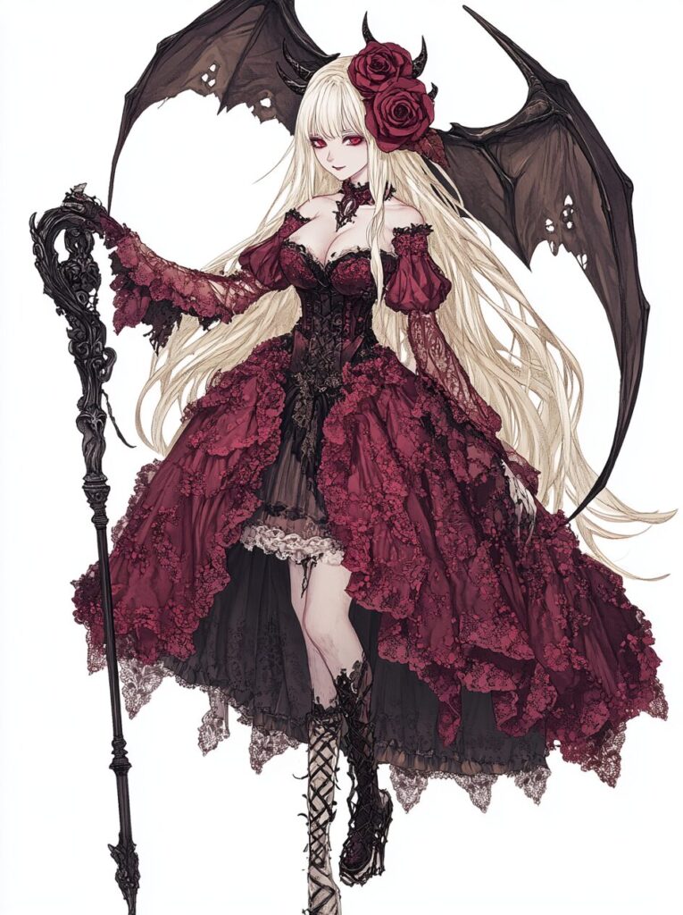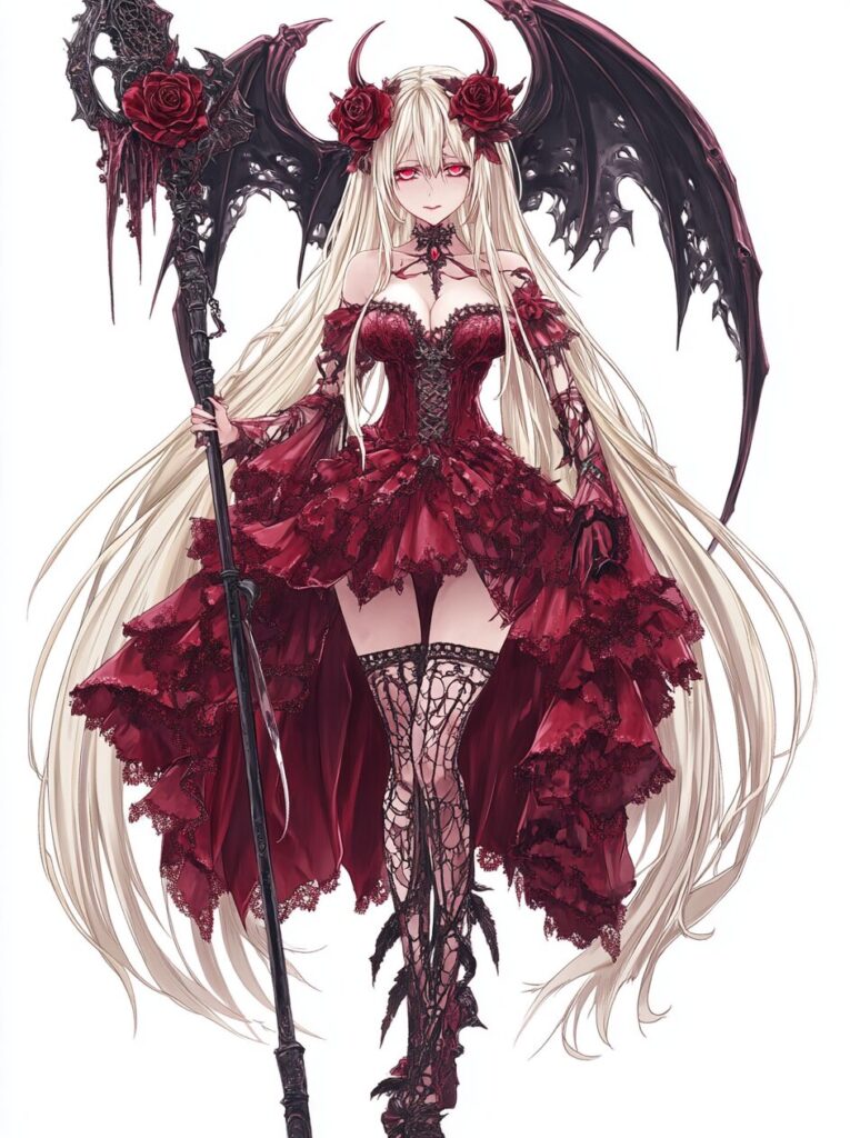 Grimoire devils Agares, A full-body anime-style character with long white hair and red rose-colored eyes, wearing an elaborate Victorian-style dress and holding a scythe, in a dark fantasy style. The character has a red lace outfit, gothic boots, and dark pink roses in her blonde hair. The character design is highly detailed, set against a white background. --ar 95:128 --v 6.1