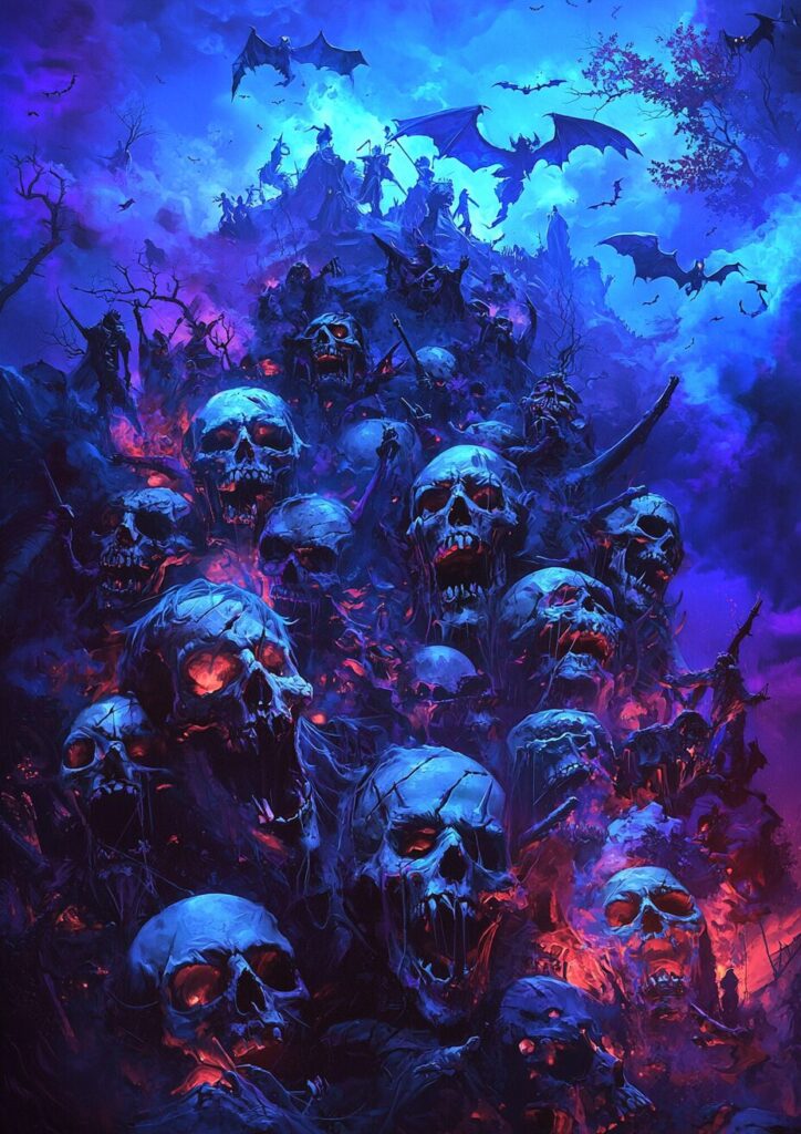 funny epic neon Halloween, blue and purple colors immense details, spooky fest, deamons party, dipping atmosphere, demons Hades --chaos 15 --ar 5:7 --quality 2 --v 6.1