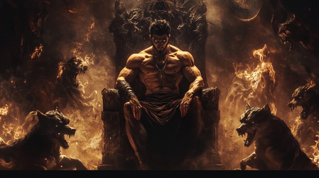 Hades, the god of the underworld, aged 22, seated on a dark throne in the depths of the underworld. His muscular body, with defined abs and pecs, is partially shrouded in shadows, his piercing eyes glowing with power. The spirits of the dead swirl around him, and Cerberus, his three-headed guard dog, stands by his side. Photo taken by a professional photographer. showing skin, soft symmetric facial features. color photo. international award winning photograph. shot with a hyperrealistic 8k camera Panasonic Lumix TZ200. --ar 16:9 --v 6.1