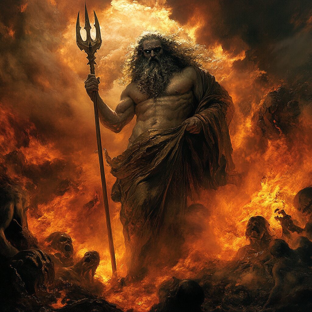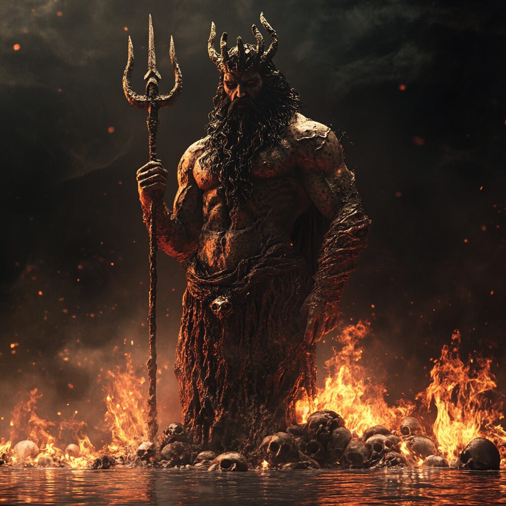 Generate an extremely detailed and hyper-realistic image of the mythological figure Hades, from ancient Greek lore, standing above lake of fire with regality. This mystical figure is characterized by his hand clutching a trident. The environment around him is sinister yet captivating, with dramatic interpretations of Greek mythology. Tortured souls surround him everywhere. Shadows play hide and seek in the corners, adding to the eerie chill of the underworld. Silver streaks of moonlight shine through on the scene. Ultra realistic, demons Hades --v 6.1