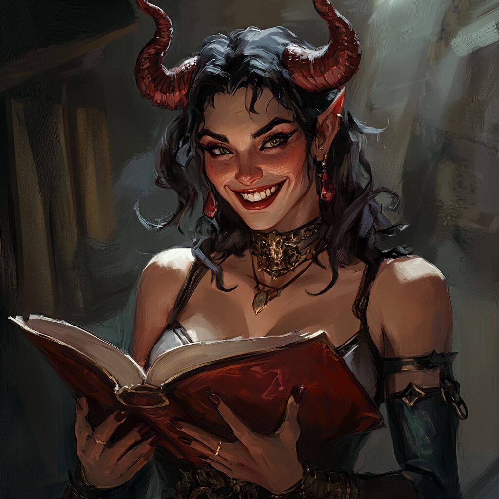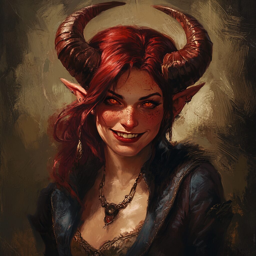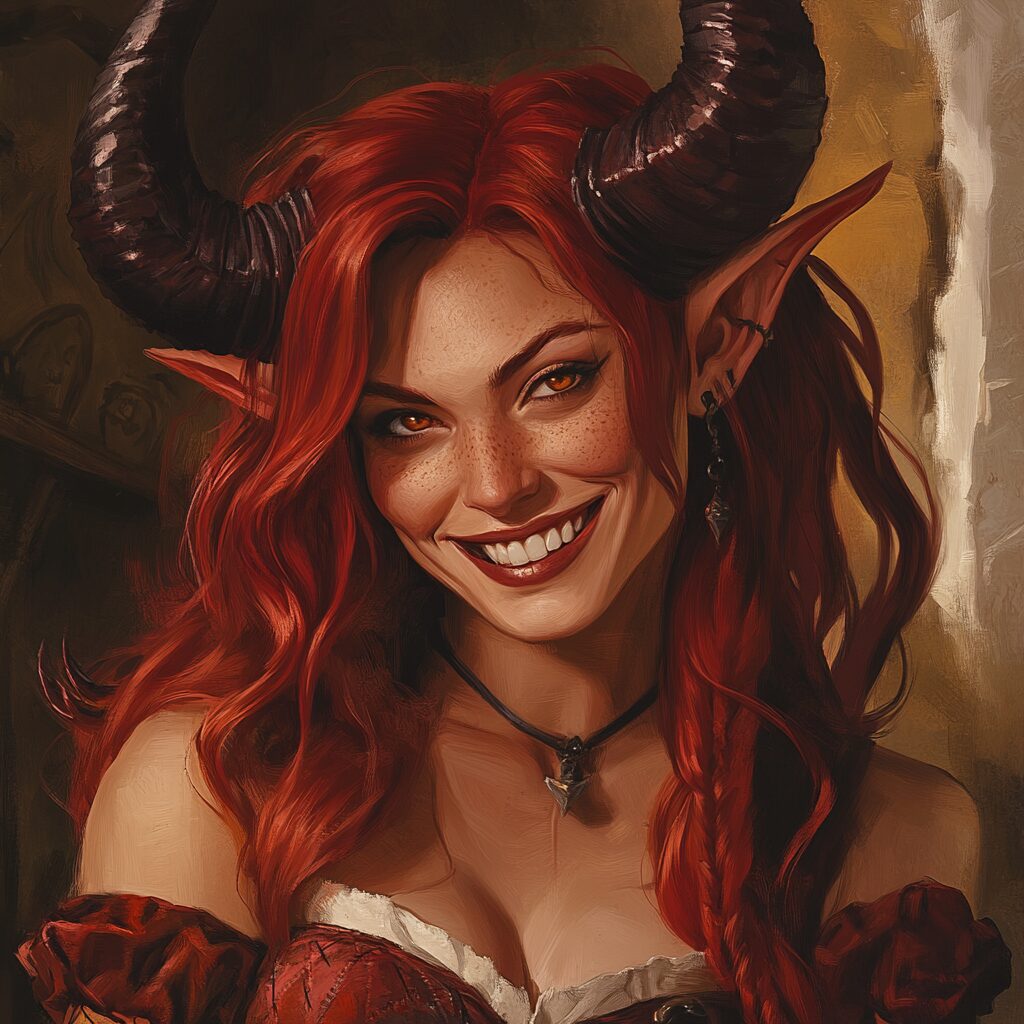 Grimoire devils Marbas, art by trystan Falcone, snarky, grin, woman, dnd art, dnd character, tiefling with red skin, horns --v 6.1